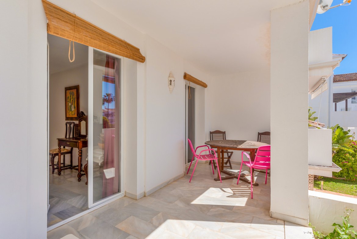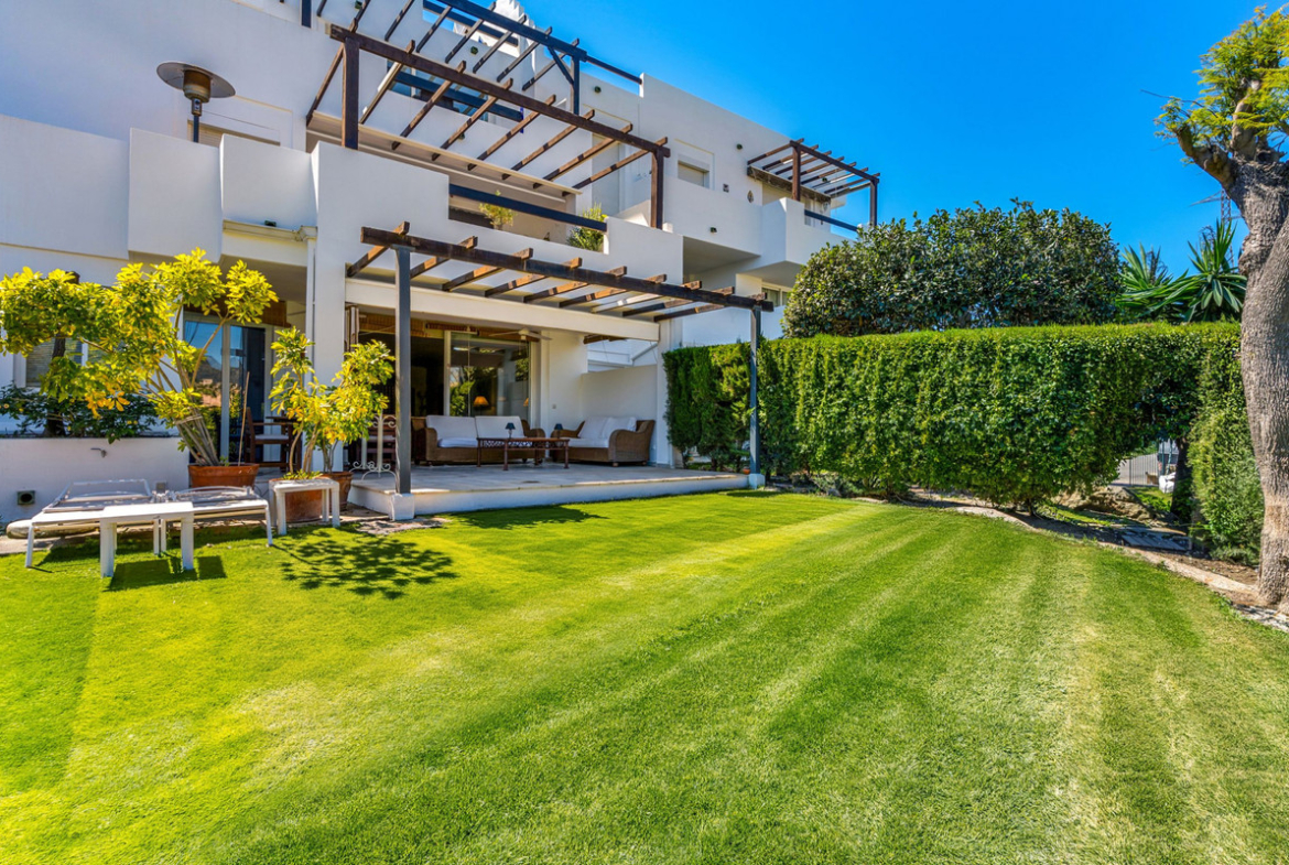 Spacious three-bedroom ground floor apartment situated in the sought-after community of Las Jacarandas, Bel Air, within a gated complex featuring beautifully landscaped gardens, two communal swimming pools, and concierge service. Ideally located close to the beach and a wide range of leisure amenities, including golf courses. This property offers an open-plan living and dining area with direct access to a private terrace and garden; a fully fitted kitchen with an enclosed utility room; two guest bedrooms with access to a private terrace; a guest bathroom; and a master bedroom with en-suite and access to the private garden. Additional features include hot and cold air conditioning, marble flooring, fitted wardrobes and a private parking space.