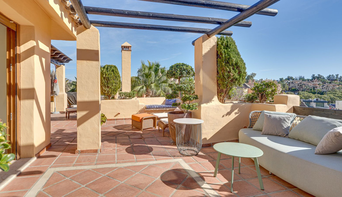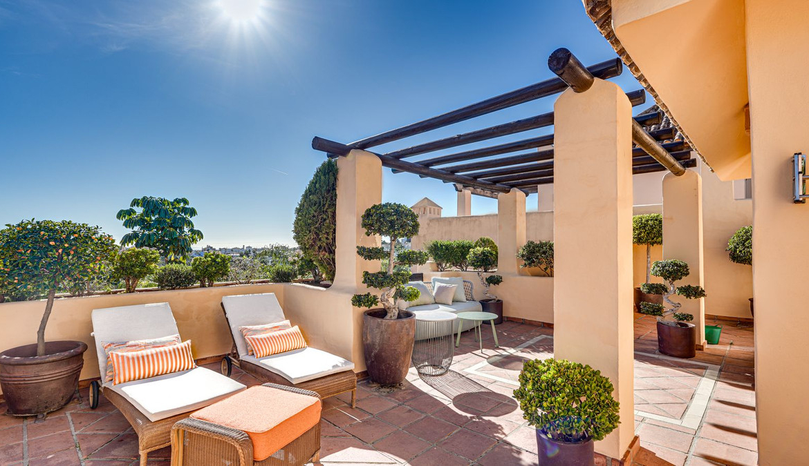 Mediterranean-style duplex penthouse with multiple terraces and a rooftop terrace with a private sauna!