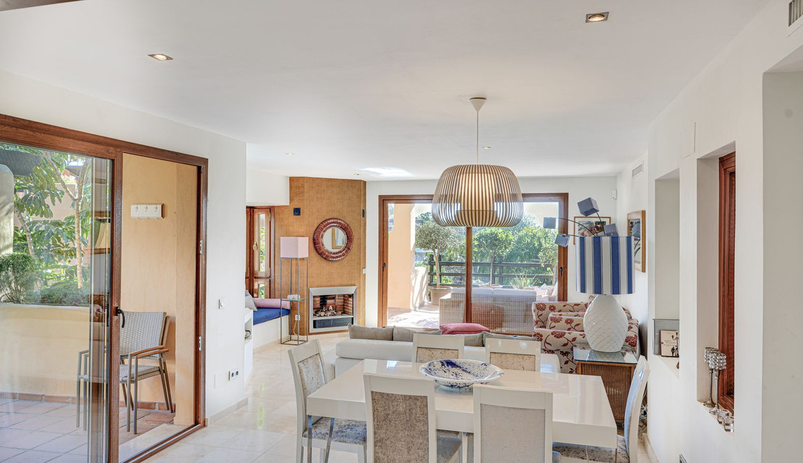 The bright living area with fireplace opens to another sheltered terrace with views of the greenery.