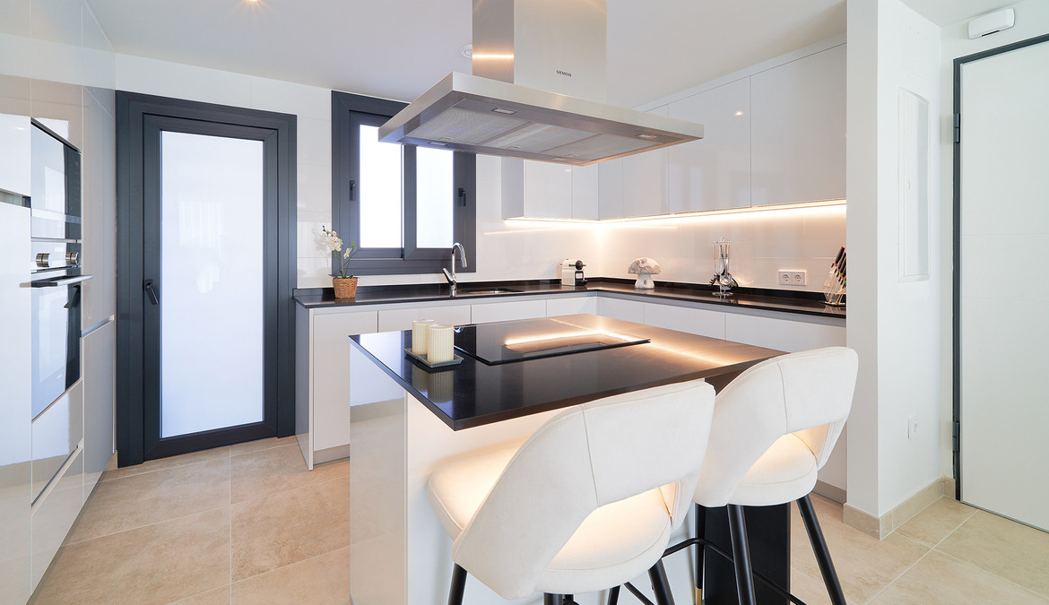 The kitchen is delivered fully equipped with integrated appliances (oven, hob, extractor hood, refrigerator, dishwasher, microwave, and washing machine), quartz countertops, and contemporary design cabinetry.