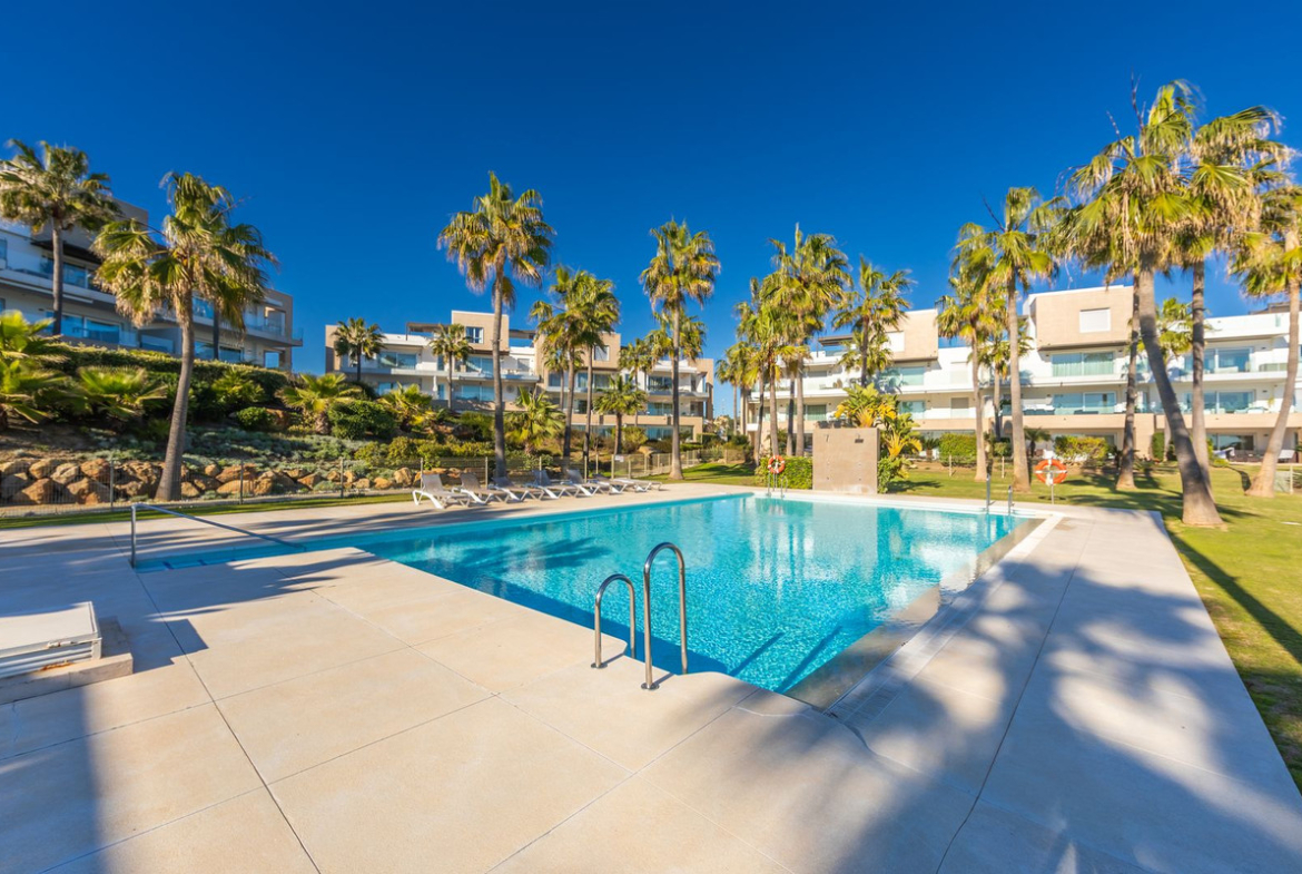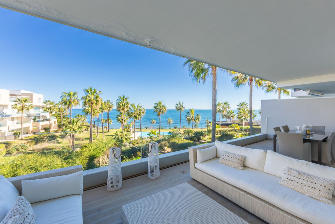 Modern-style apartment located on the beachfront, offering stunning sea views from which to enjoy spectacular sunrises, situated in the magnificent Horizon Beach development and built by the prestigious developer Taylor Wimpey, renowned for its contemporary design and high-quality finishes. The impeccably maintained community provides direct beach access, lush Mediterranean gardens, and an elegant heated outdoor pool for year-round enjoyment, along with refined communal areas designed for relaxation, featuring comfortable loungers and a spacious covered terrace in a privileged setting. Just a 5-minute drive from the center of Estepona and Puerto de la Duquesa, with all services close at hand, it includes a convenient underground parking space and a large storage room located right in front of the parking, making it an excellent beachfront opportunity that must be seen.