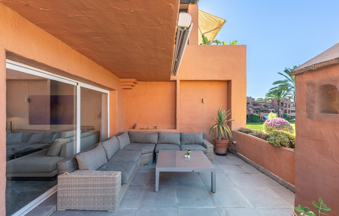 This fabulous apartment is located in one of the best and most exclusive developments in Guadalmina Baja. It faces south with views of the lush tropical communal gardens and the oversized pool area that resembles a beach.