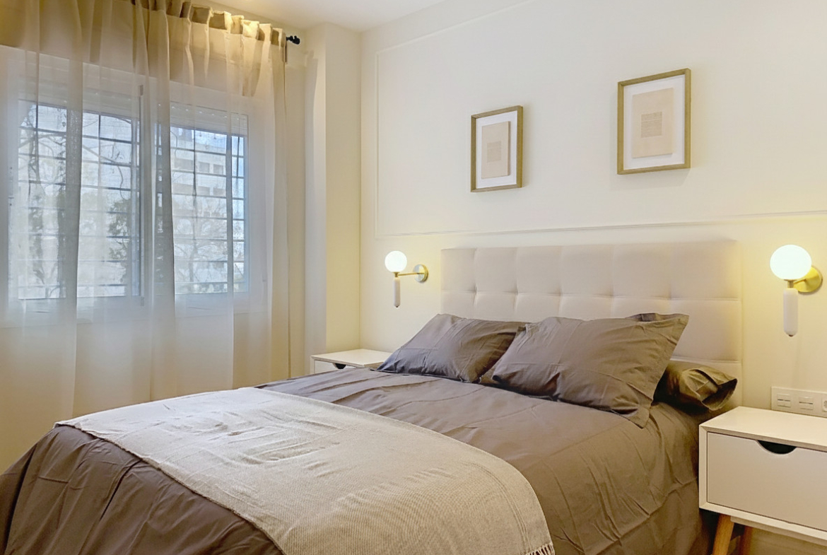 The apartment features three spacious bedrooms, all with new, lined, and illuminated built-in wardrobes, as well as ceiling fans and a powerful air conditioning system (8,000 frigories) that ensures maximum comfort throughout the year. The master bedroom has an en-suite bathroom with a modern shower and access to a balcony overlooking the interior of the complex, while the other two bedrooms—one currently used as a dressing room—share a second full bathroom. Both bathrooms stand out for their complete renovation with top-quality finishes, each featuring exterior windows that provide perfect ventilation. They include sliding glass shower screens designed to offer greater comfort and elegance.