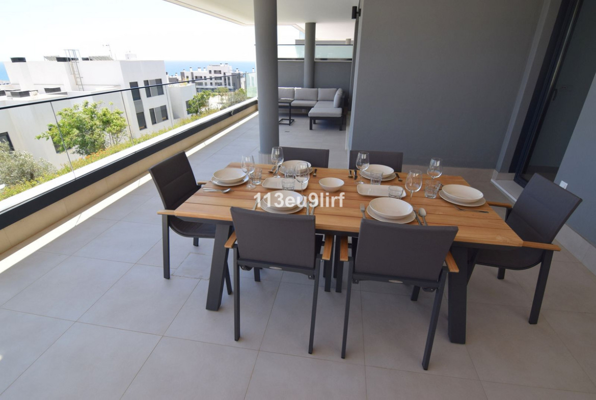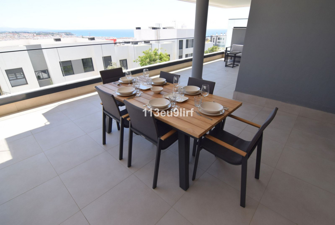 Situated in Las Mesas, just outside the center of Estepona, this spacious luxury apartment offers peace and tranquility but is still close to the beach, port and city center. It consists of a large living/dining room, a fully equipped kitchen with adjacent utility room, the en suite master bedroom and two more bedrooms sharing a shower room. Additionally there is a covered front terrace with sea views and a small patio at the back. Underground parking space for one car and storage room. The complex with video surveillance is extremely well maintained, with tropical gardens and a beautiful pool. Heated indoor pool and gym (400 meter from the apartment). Air conditioning hot & cold, high speed internet.