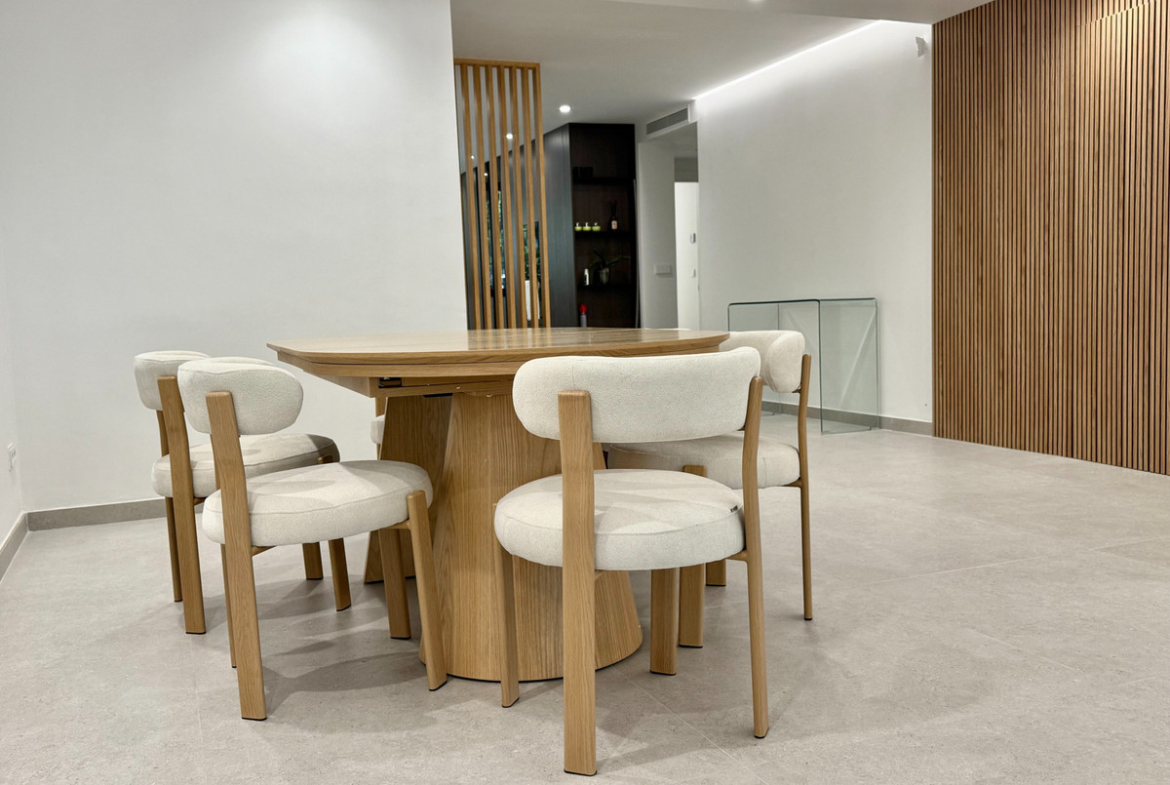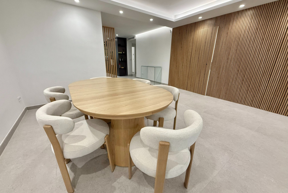 The spacious living and dining area opens directly onto a sun-drenched terrace, seamlessly connecting to a private garden with an outdoor kitchen—perfect for entertaining or relaxing in privacy.