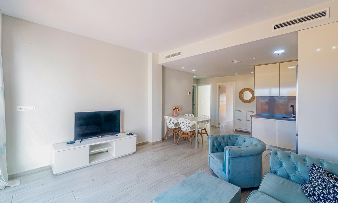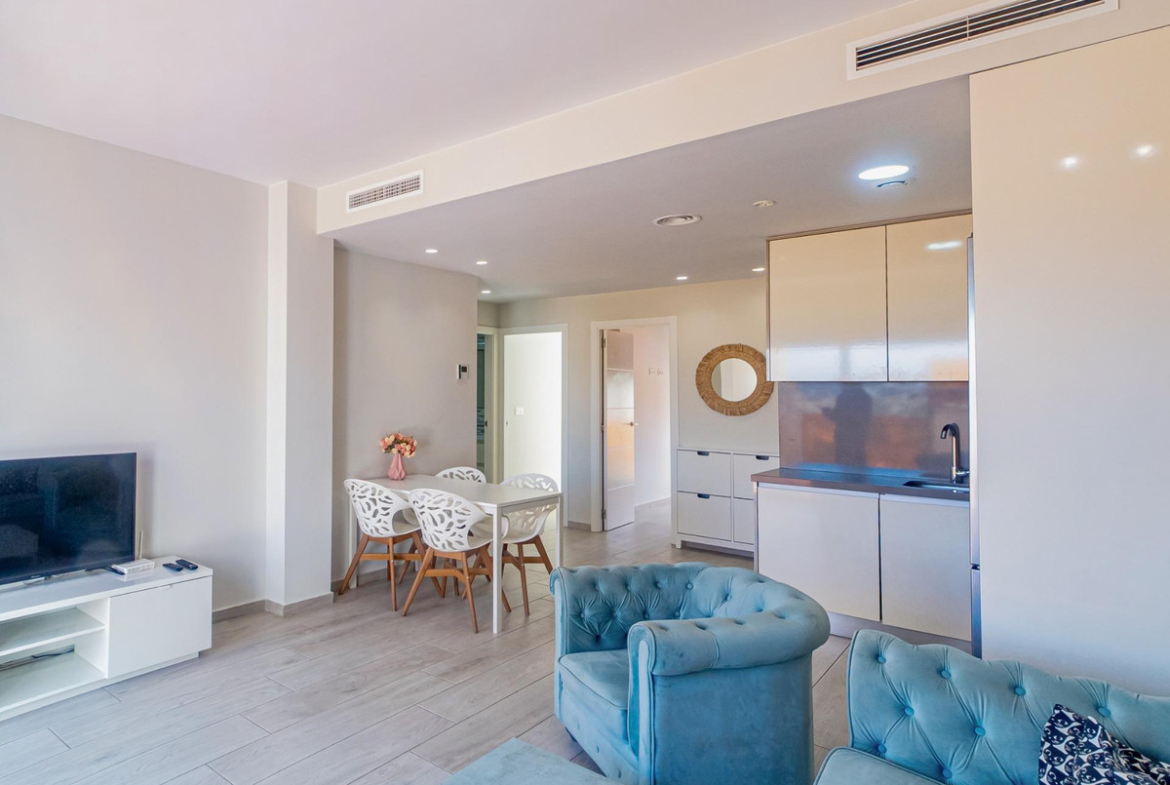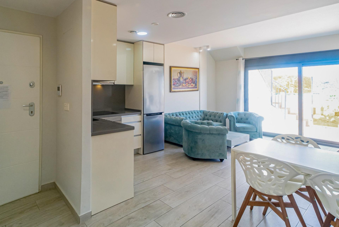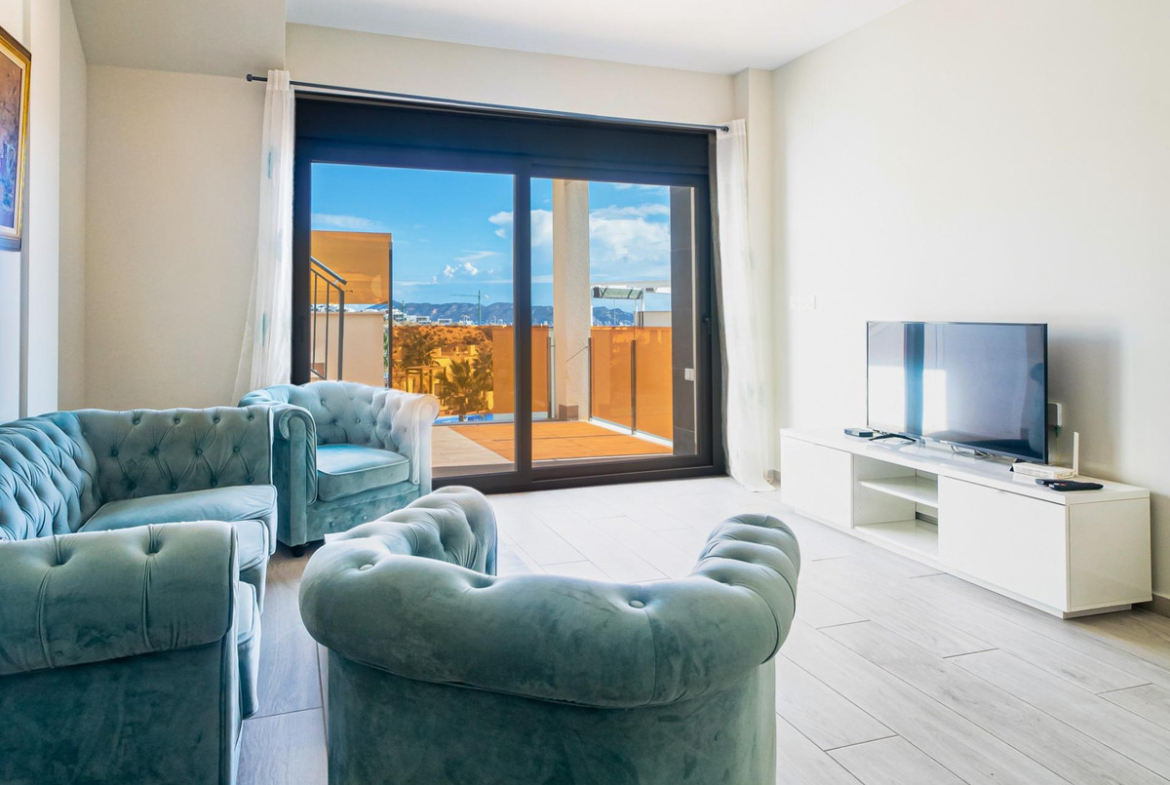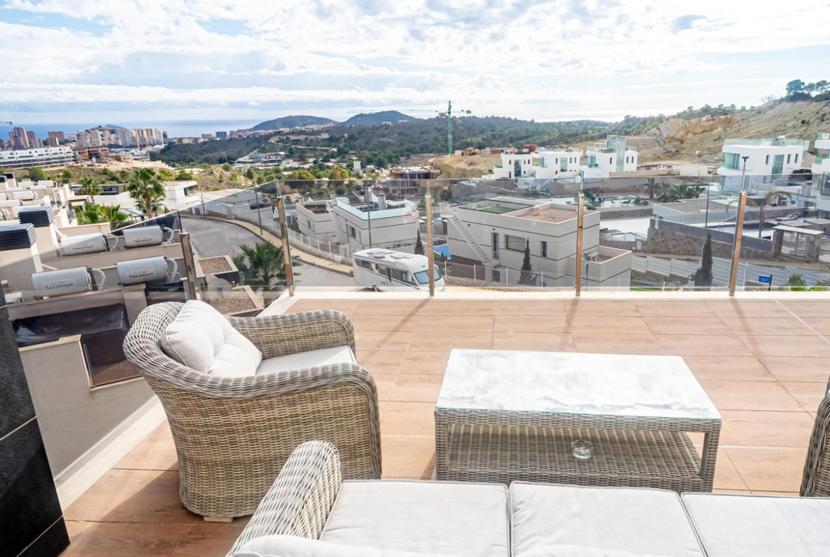 This corner penthouse is located in the new area of Finestrat. The apartment has plenty of natural light and is in very good condition. It features 3 bedrooms, one of which has a small balcony, two bathrooms with underfloor heating, (one of them is an en-suite bathroom), open-plan kitchen, and living room with access to a balcony with a storage room and to a 90 m² solarium. The terrace enjoys sunlight all day, has electricity and water supply, a storage room for the washing machine, and impressive mountain and sea views. The water is heated by solar panels, and the apartment has air conditioning for both cooling and heating. A parking space is included in the price, located in front of the building.