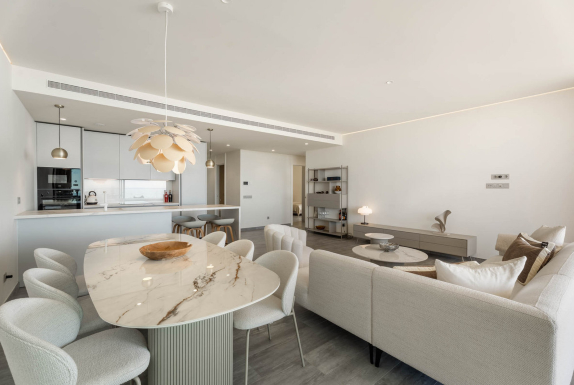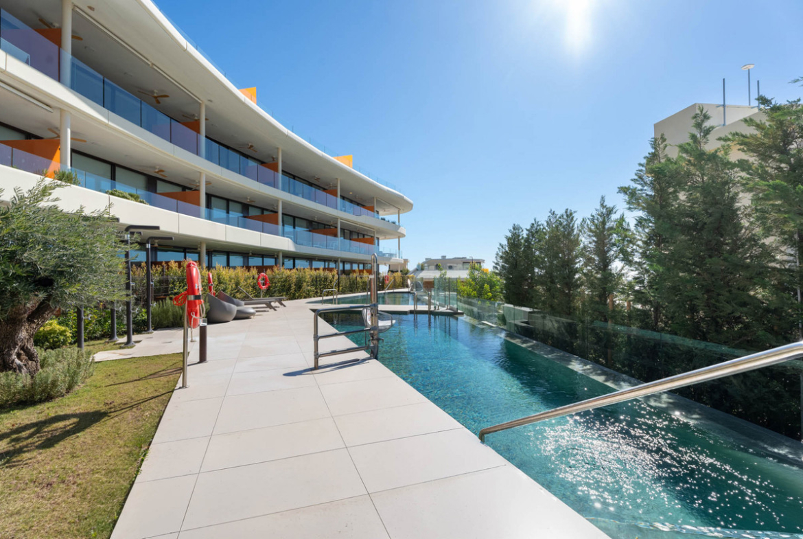 The property is sold fully furnished by BoConcept and includes two underground parking spaces and a storage room. Residents enjoy landscaped gardens, an infinity pool with sun loungers, and 24-hour gated security.