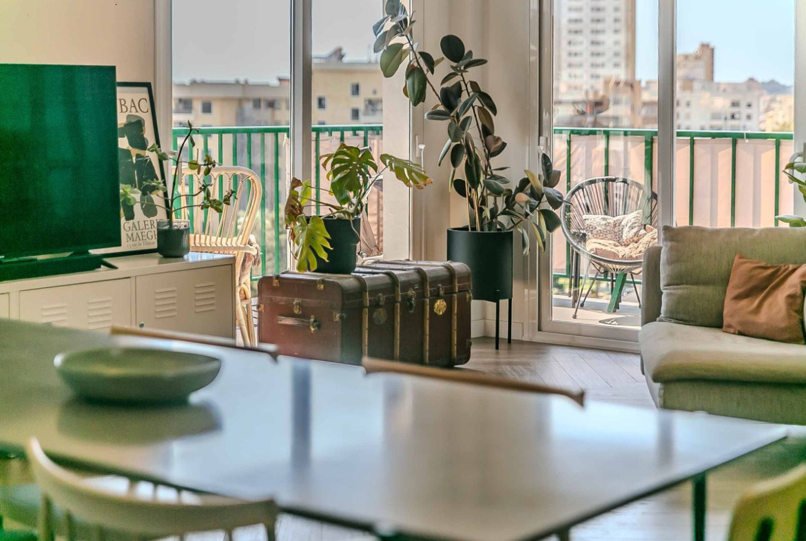 The property offers three double bedrooms, two modern bathrooms and a living-dining room with an integrated kitchen that opens up to natural light. The third bedroom, which is glazed and connected to the living area, is ideal as an office or guest room, adding versatility to the space. It also has a practical laundry room hidden behind wooden slats, maintaining the order and aesthetics of the flat. Every detail of the flat has been designed to offer comfort and contemporary style, with elegant finishes and a functional layout.