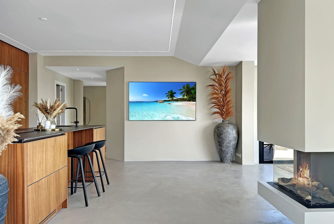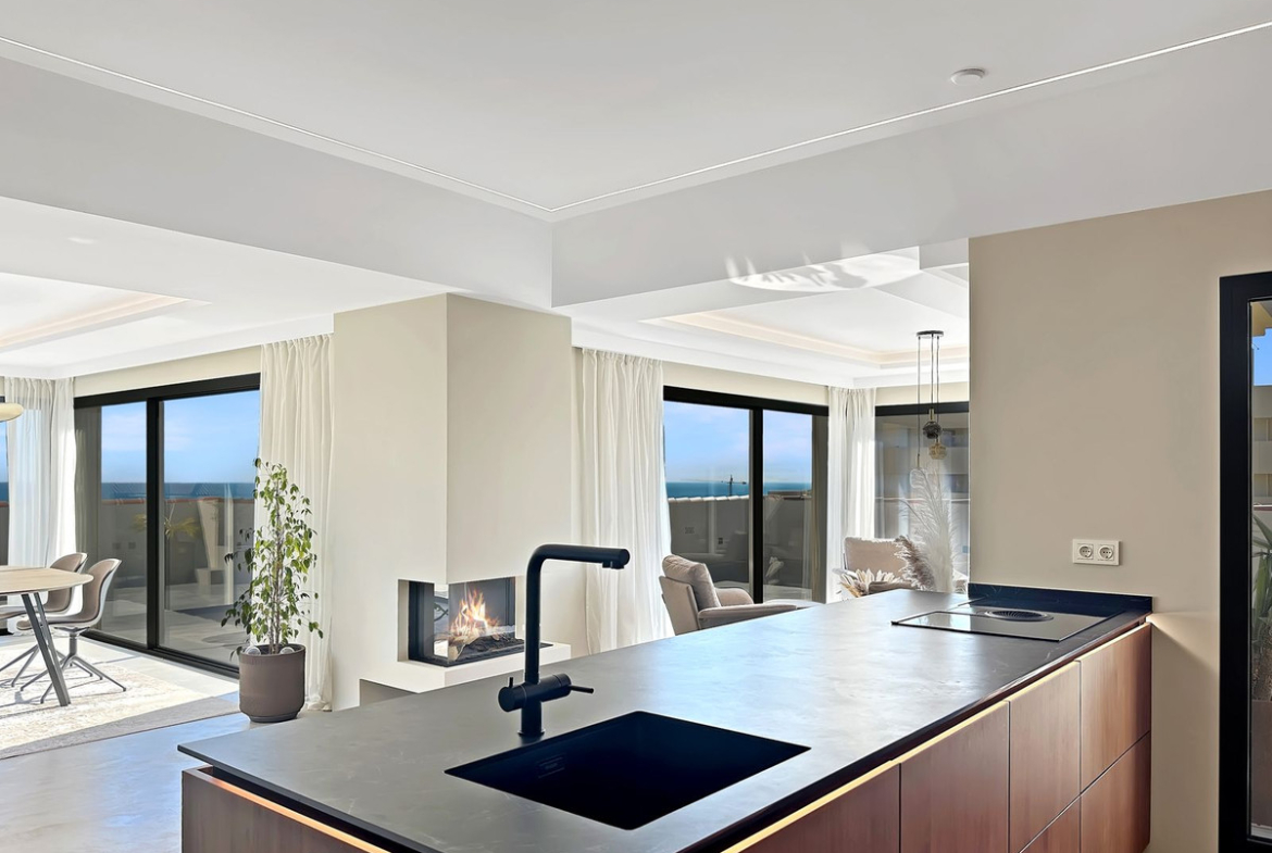 The open-plan layout is the heart of this penthouse. The indoor living space is 135 square meters, featuring a seamless flow between the lounge, dining area, and the stunning kitchen. The kitchen boasts elegant walnut finishes, a composite countertop, fully integrated appliances, and a central kitchen island with an induction cooktop. A cozy fireplace is strategically placed to create a warm and romantic feeling in the open living area on late evenings.
