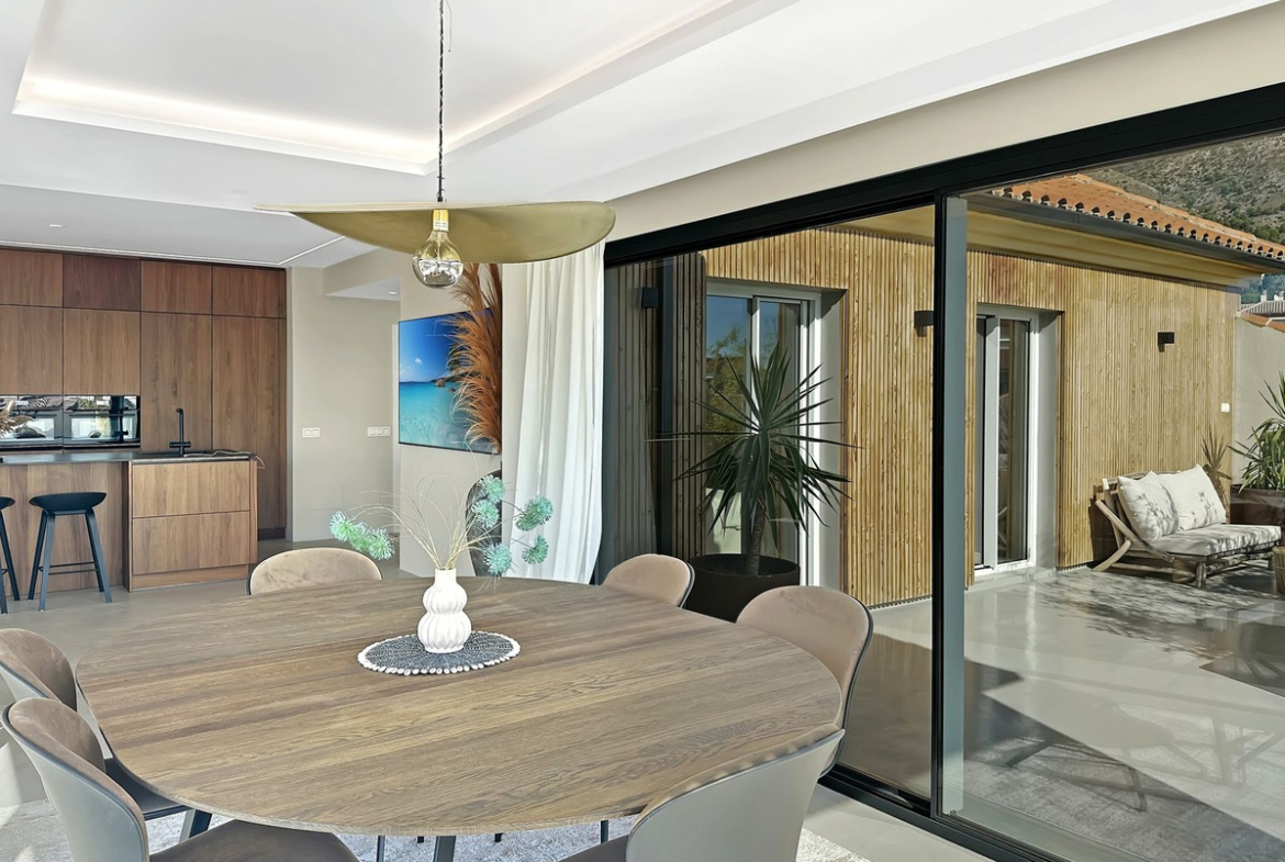 The total property area is 273 square meters, dominated by the impressive 138-square-meter terrace. This exceptional outdoor space is designed for maximum enjoyment, providing stunning, panoramic views of both the sparkling Mediterranean sea and the majestic mountains. The terrace is also prepared with water, drain and electricity installations for the use of a private jacuzzi and awnings.
