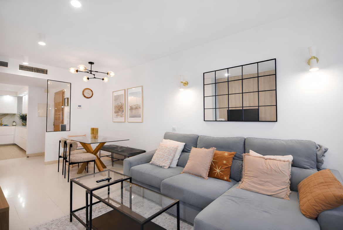 Spacious living dining room with direct access to a southeast facing terrace, perfect for enjoying the morning sun and pleasant sea views