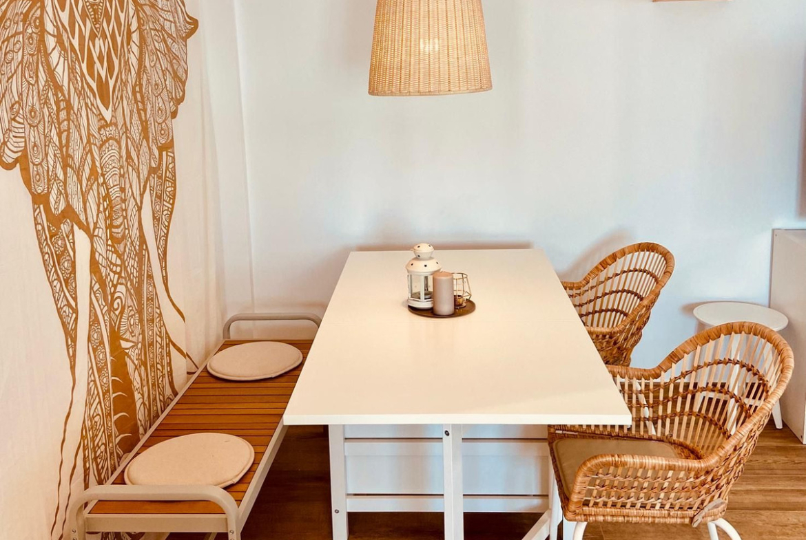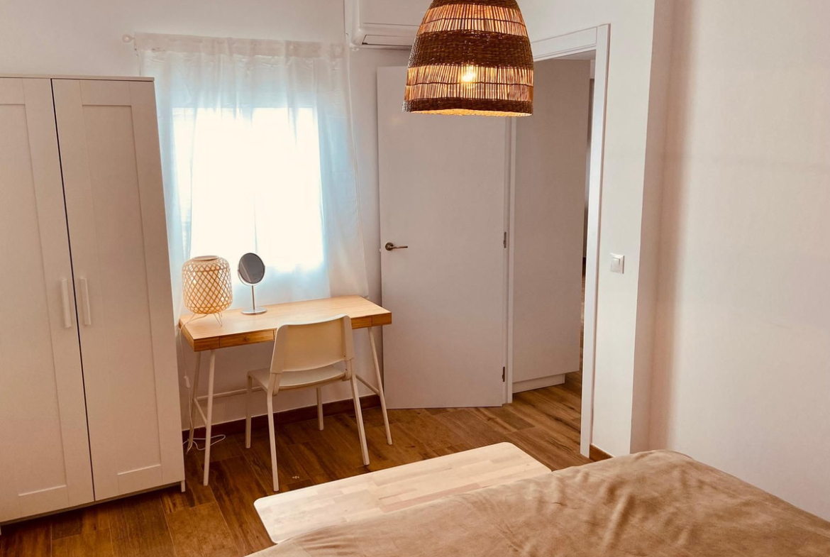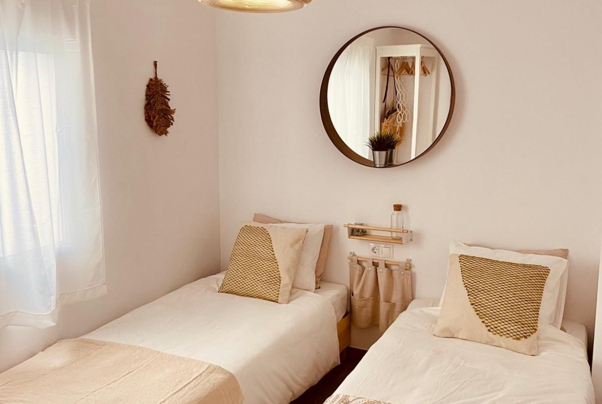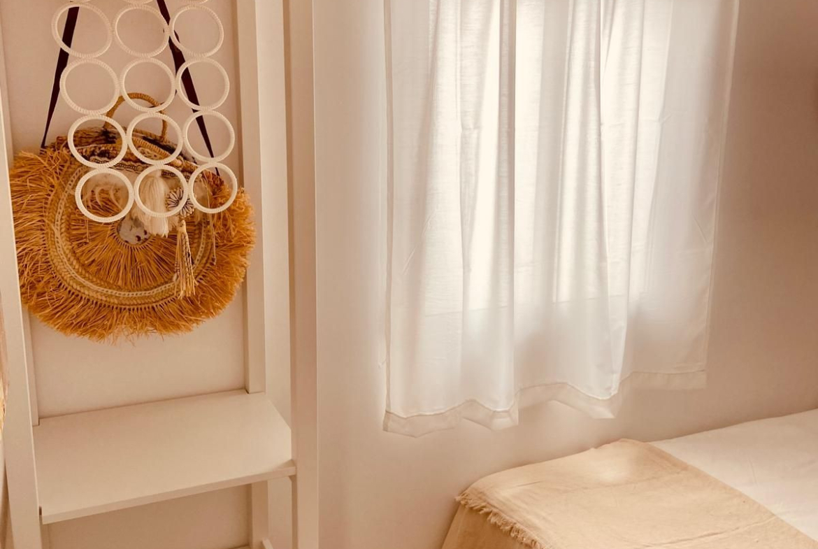 This apartment was completely renovated in a Boho Ibiza style, featuring a bright white and natural wood design that creates a warm, modern, and relaxing atmosphere.