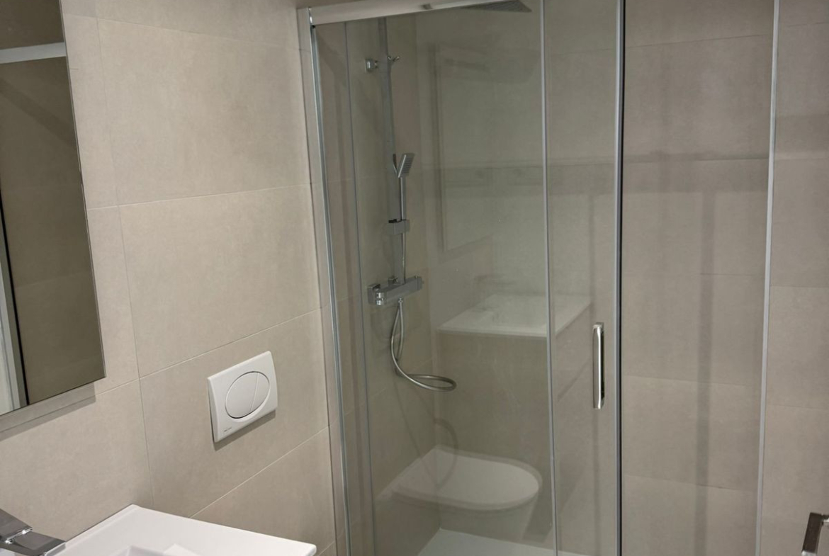 This modern first-floor apartment features three bedrooms and two bathrooms.