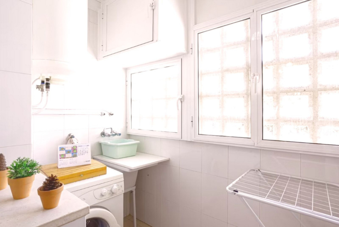 It features a spacious, fully equipped independent kitchen with a laundry room.