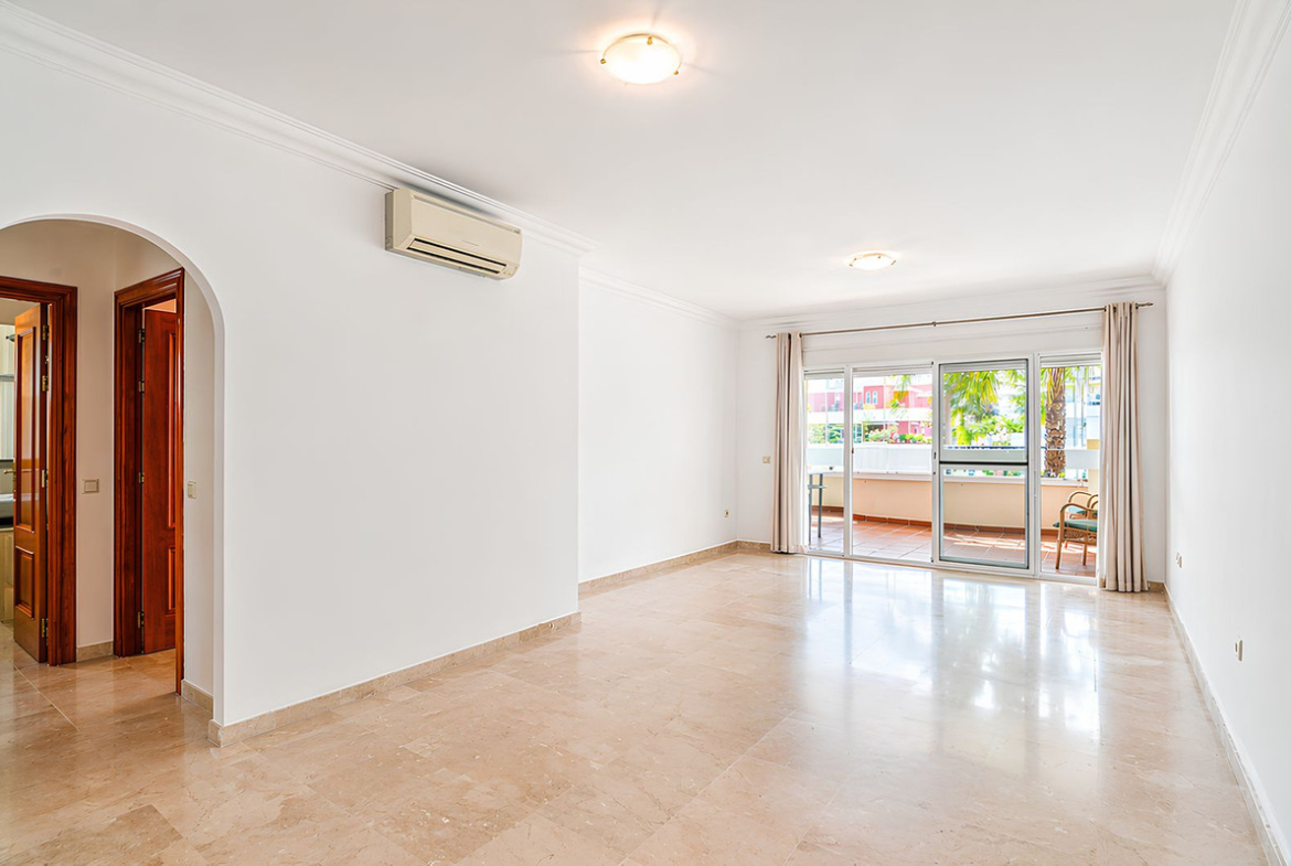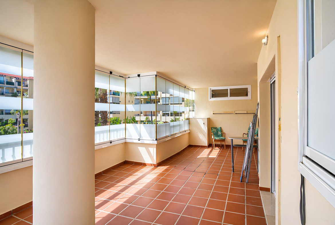 The property features three bedrooms, all with plenty of natural light, and two fully fitted bathrooms designed for everyday convenience. The spacious and bright living room opens onto a charming glass-enclosed terrace, ideal for year-round enjoyment, with lovely views over the communal gardens and swimming pool.
