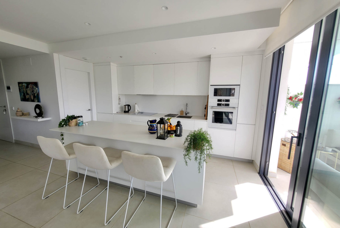 Expansive open-plan living and kitchen area that flows onto a large, south-facing terrace, effectively doubling the living space and being on a corner location provides privacy and panoramic views of the sea and mountains.