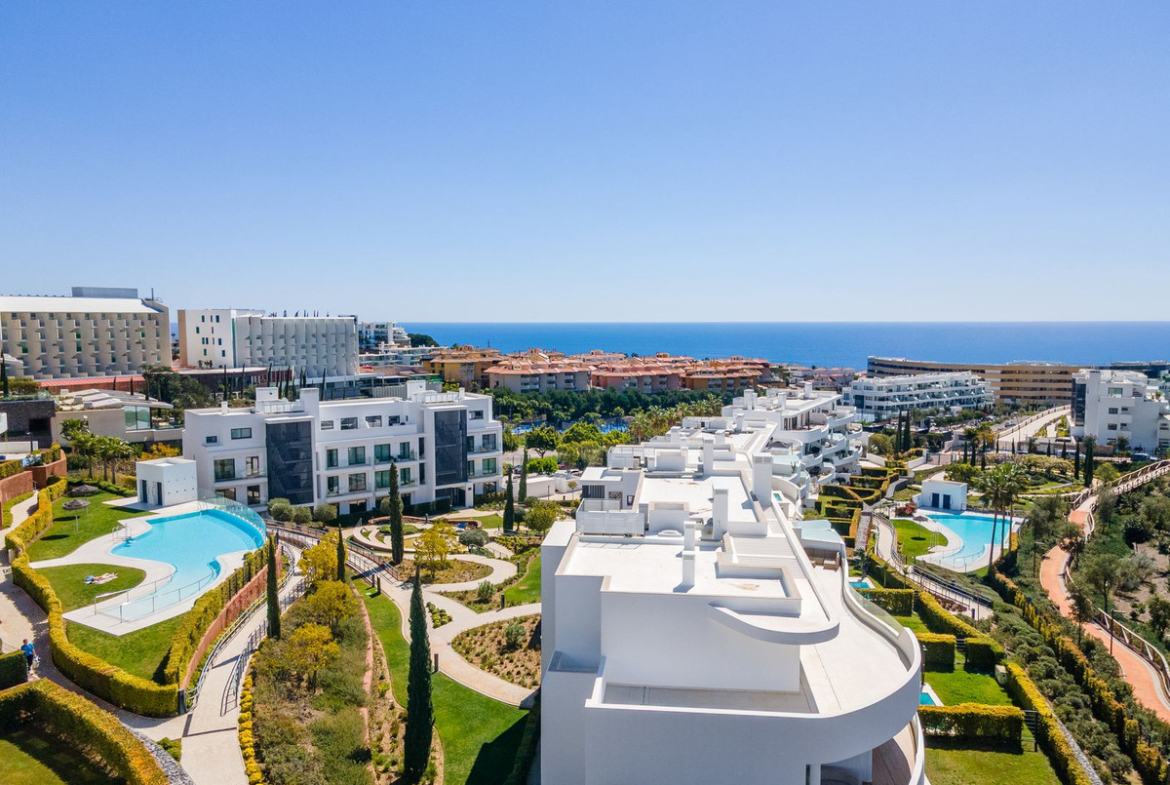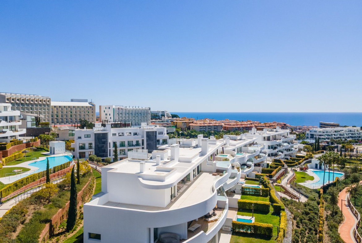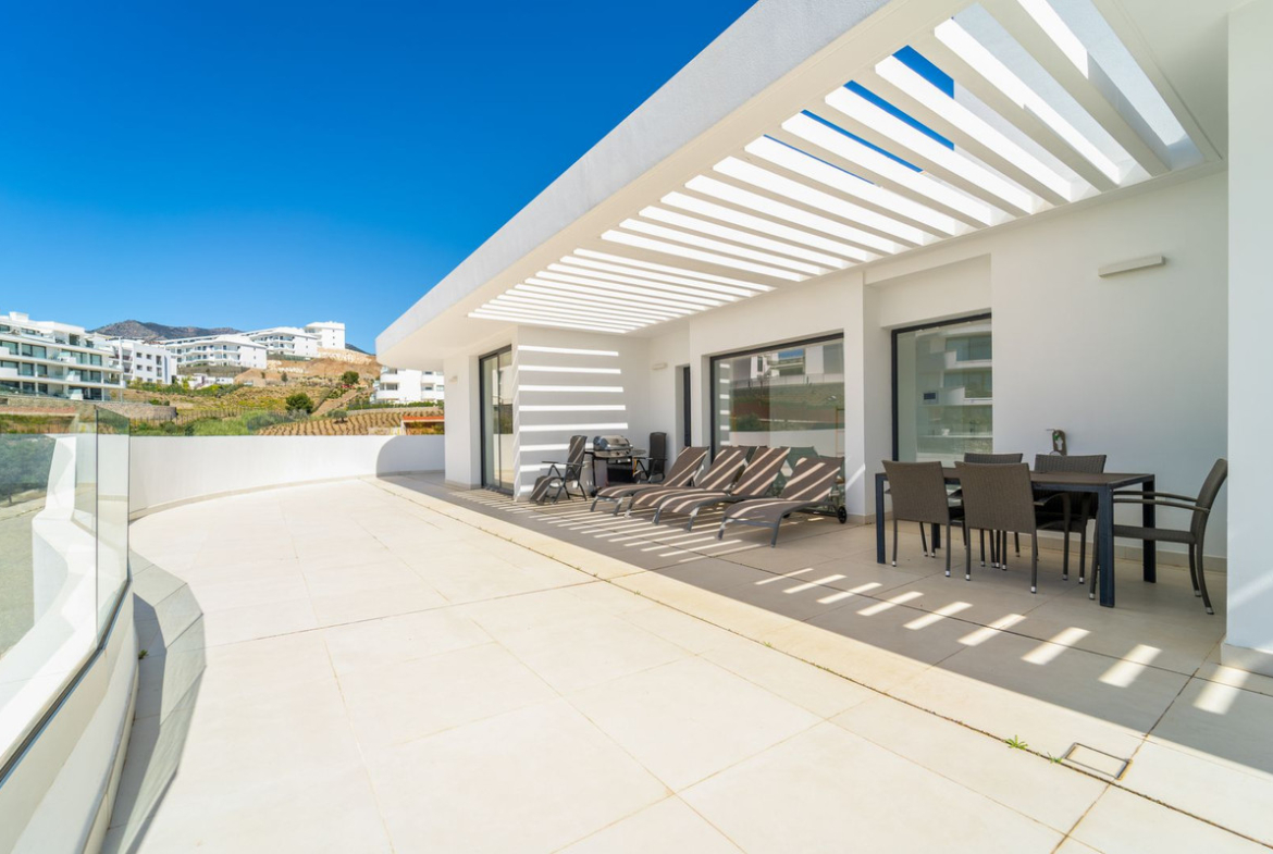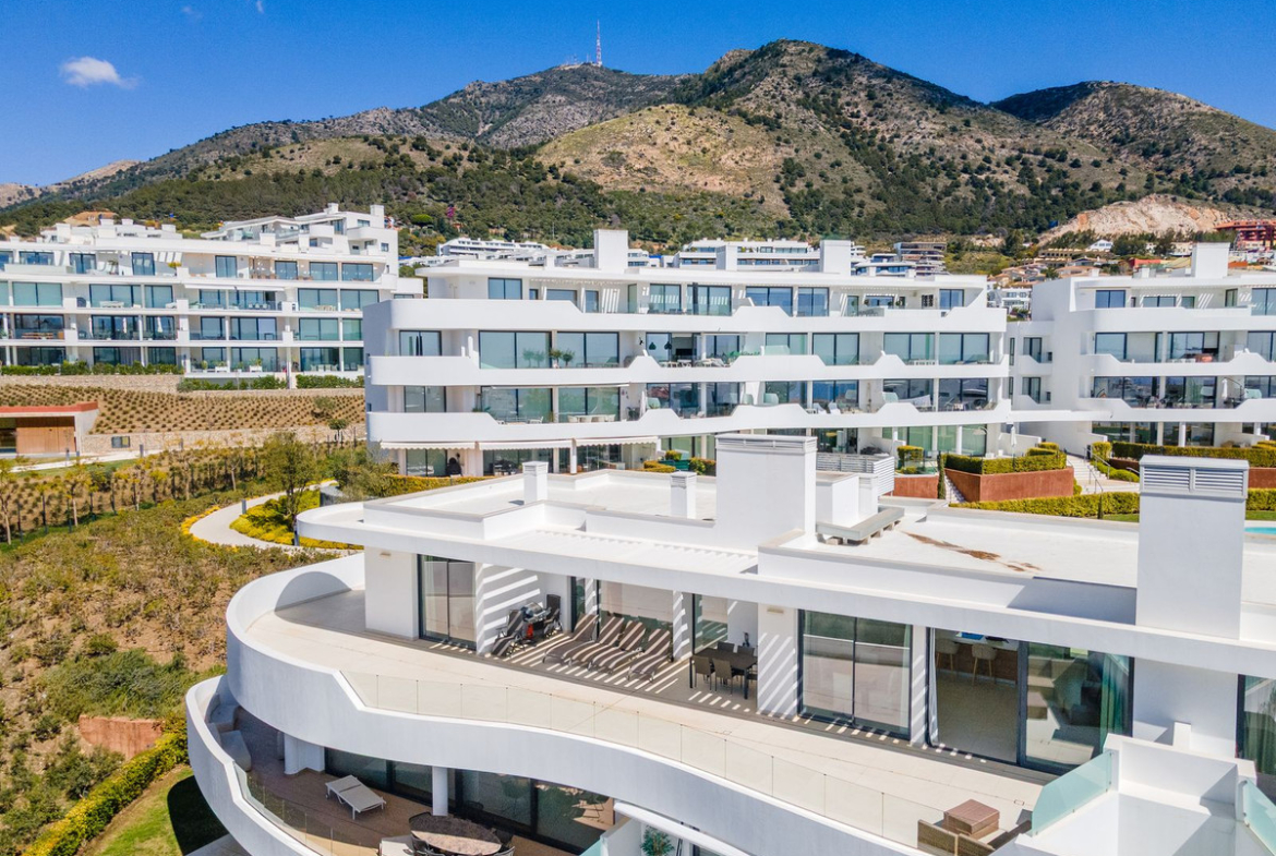 Luxury west facing penthouse, located in the exclusive urbanization of Higuerón West. Consists of entrance, hall way, spacious living-dining room with floor to ceiling glass sliding doors leading out to a large wrap around terrace of 158m2, with views of the mountains, gardens and partial sea views. Open plan kitchen fully furnished and equipped with electrical appliances from Bosch and laundry area with washing machine/dryer. Main bedroom with ensuite bathroom and walk-in closet, 2 extra bedrooms with built-in wardrobes and guest bathroom. There is also a backside terrace of 15m2 with access from the living room. Air conditioning hot and cold by Airzone, video intercom, domotic system, pre-installation alarm system, floor heating in both bathrooms. Includes two parking spaces and one storage room.
