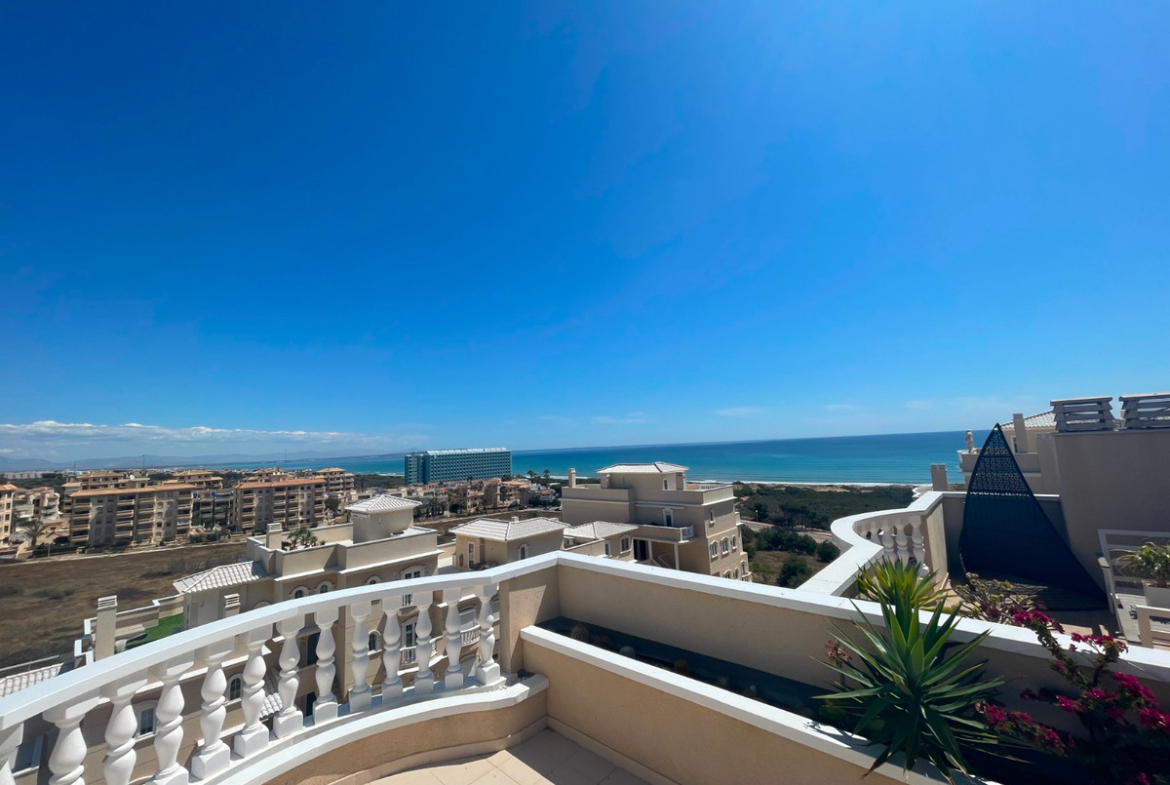 Live on the beachfront in absolute luxury!Discover this stunning duplex penthouse located in the prestigious Pórtico Mar residential complex in Guardamar del Segura. A unique opportunity to enjoy elegance, space, and breathtaking sea views.This bright and spacious property is distributed over two floors and features 2 large en-suite bedrooms, offering maximum privacy and comfort. The open-plan living and dining area is flooded with natural light thanks to large windows that create a warm and welcoming ambiance all day long.Upstairs, you'll find a private rooftop solarium with a fully equipped outdoor kitchen—perfect for al fresco dining, entertaining guests, or simply relaxing while taking in uninterrupted views of the sea and swimming pool.The penthouse also includes two stylish enclosed balconies, ideal for enjoying panoramic views year-round.Located in a beautifully maintained complex with landscaped gardens and swimming pools, this home offers a safe and peaceful environment for families and individuals alike.Its prime location, just steps from the beaches of Guardamar and close to shops, restaurants, health centers, and entertainment areas, makes it an ideal permanent residence, holiday home, or high-yield investment.???? Contact us today for more information or to schedule a viewing. ???? Don't miss this unique chance to own the penthouse of your dreams!