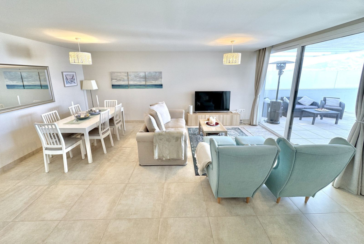 This modern luxury apartment for sale offers; spacious lounge/ dining area with large open plan modern white high-gloss fitted kitchen. With fitted oven, hob, hood, fridge freezer, microwave and dishwasher. The main living area has patio doors and 2 windows to a large (partly covered) terrace area with beautiful La Cala de Mijas sea views, ideal for both relaxing & entertaining. This beautiful apartment has 3 large double bedrooms with fitted wardrobes, two of which have patio doors to a second good size sunny terrace again with with beautiful La Cala de Mijas sea views. The Master bedroom has a walk in wardrobe & luxury en-suite shower room. There is also a 2nd family shower room. Hot & cold air-con, underfloor heating in bathrooms, private parking space and storage room. Interiors have a beautiful timeless design, with high quality finishes and feature neutral colour palettes.