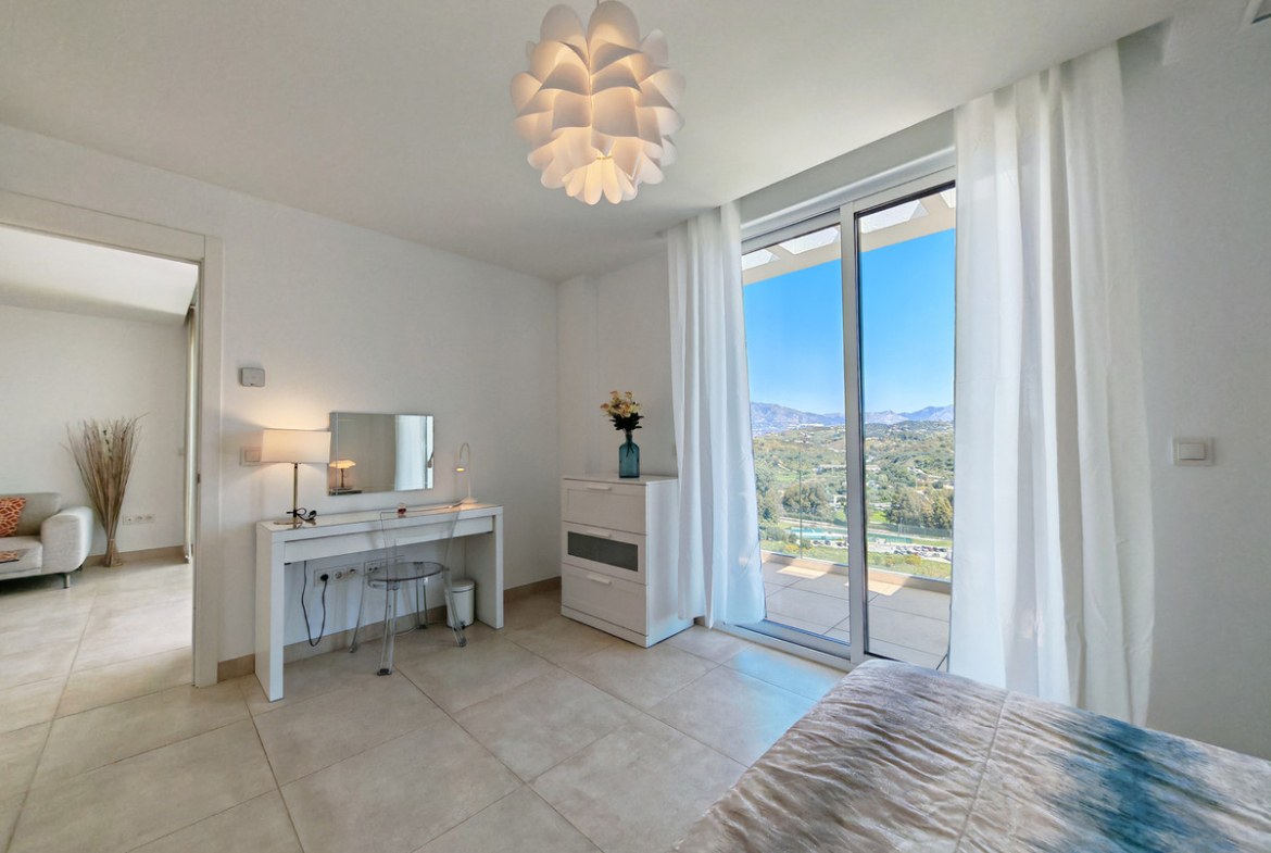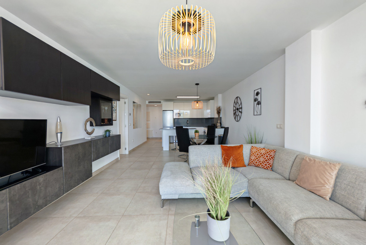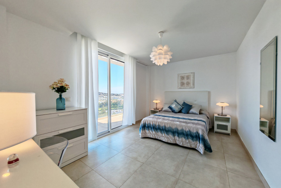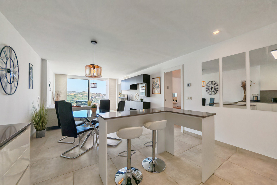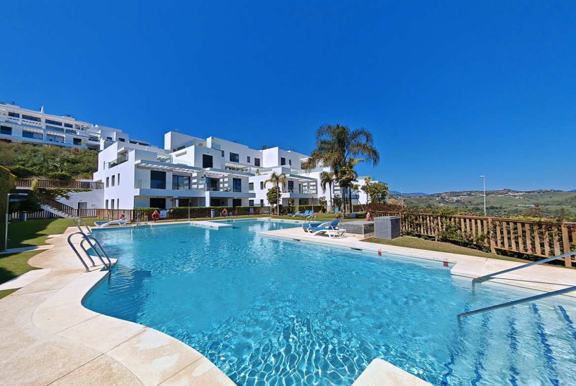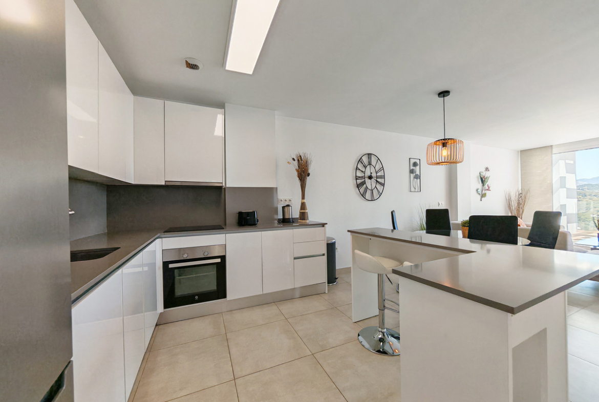 Apartment for sale in , Mijas Costa with 3 bedrooms, 2 bathrooms, 1 on suite bathroom and with orientation south/east, with communal swimming pool, private garage (1 parking spaces) and communal garden. Regarding property dimensions, it has 112.15 m² built, 97.43 m² interior and 21.61 m² terrace. Has the following facilities transport near, air conditioning, fully fitted kitchen, jacuzzi, sauna, guest room, storage room, gym, solarium, double glazing, video entrance, security service 24h, guest toilet, private terrace, kitchen equipped, living room, sea view, mountain view, golf view, indoor pool, heated pool, automatic irrigation system, security shutters, internet – wi-fi, covered terrace, 24h service, electric blinds, fitted wardrobes, gated community, lift, panoramic view, tennis / paddle court, doorman, underfloor heating (bathrooms), close to children playground, close to sea / beach, close to golf, uncovered terrace, glass doors, open plan kitchen, balcony, optional furniture, spa, wheelchair-accessible, excellent condition, close to shops, close to town, close to schools and pets allowed.