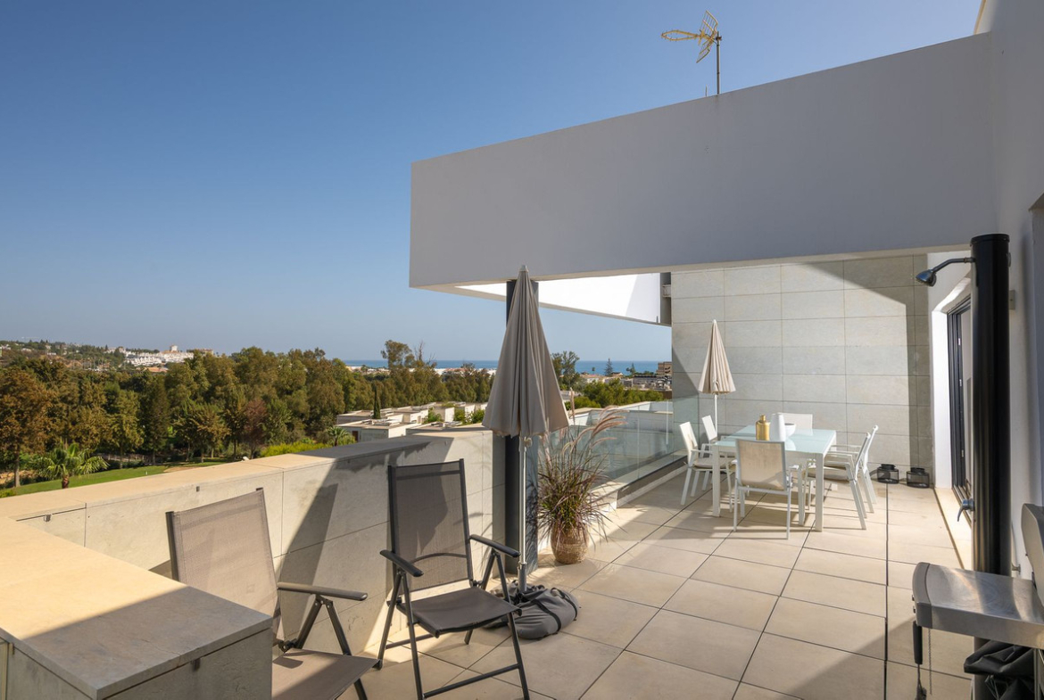 Welcome to this exclusive penthouse apartment overlooking La Noria Golf with partial sea views, located in the sought-after Navigolf Phase 4 – a modern and elegant residential complex in the heart of La Cala de Mijas.