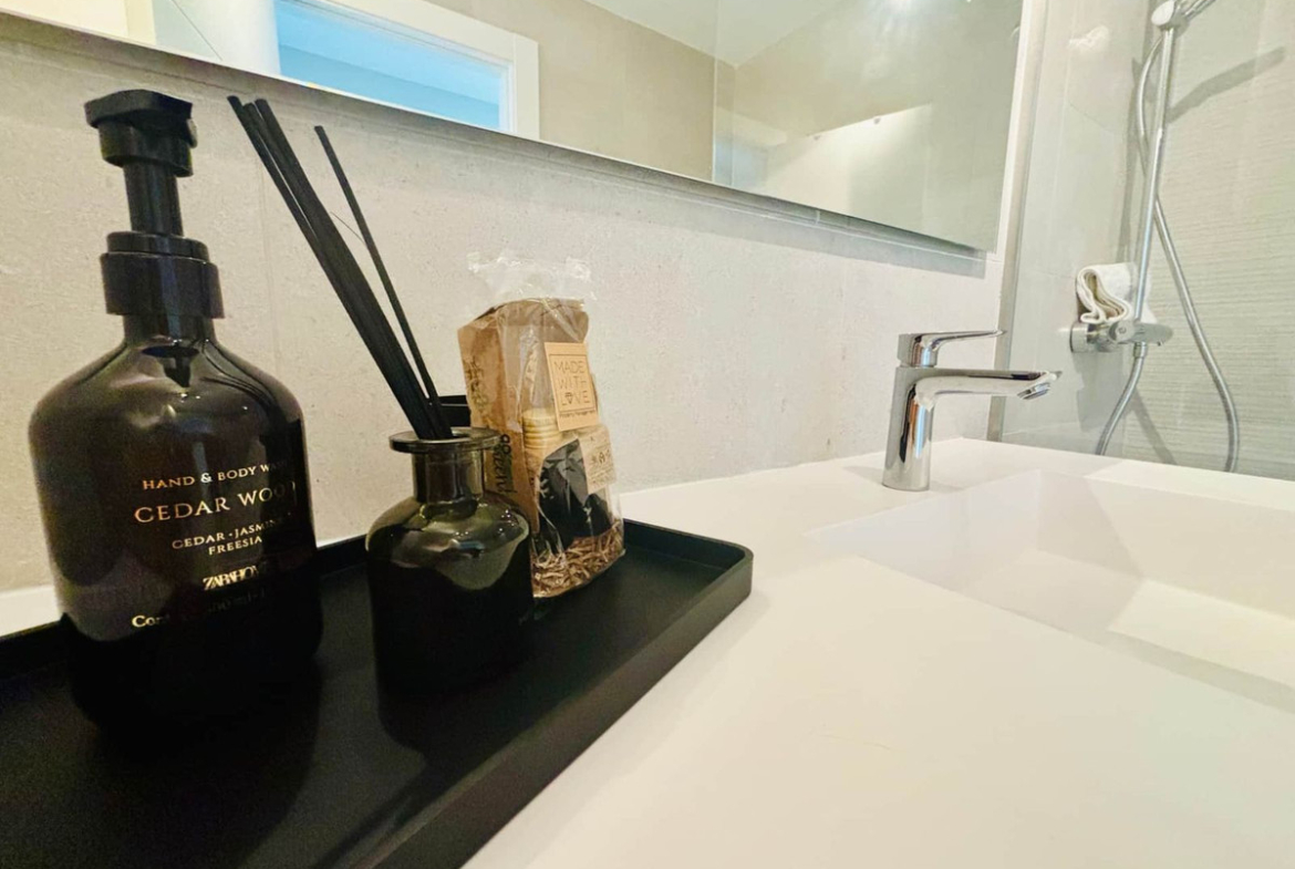 This residential area is quiet and gated, with well-kept green areas, swimming pools, SPA (indoor pool with water jets for hydromassage, dry and steam sauna, resting area) and a good size gym.