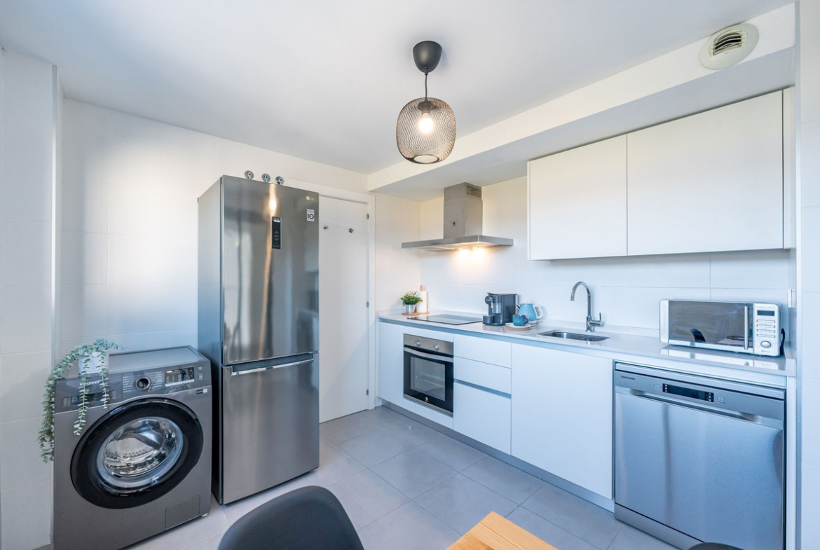 Upon entering, you are welcomed by an elegant entrance hall that leads into a large living–dining room. This bright space features a wide window that opens onto a southwest-facing covered terrace, perfect for enjoying the sun throughout the day.