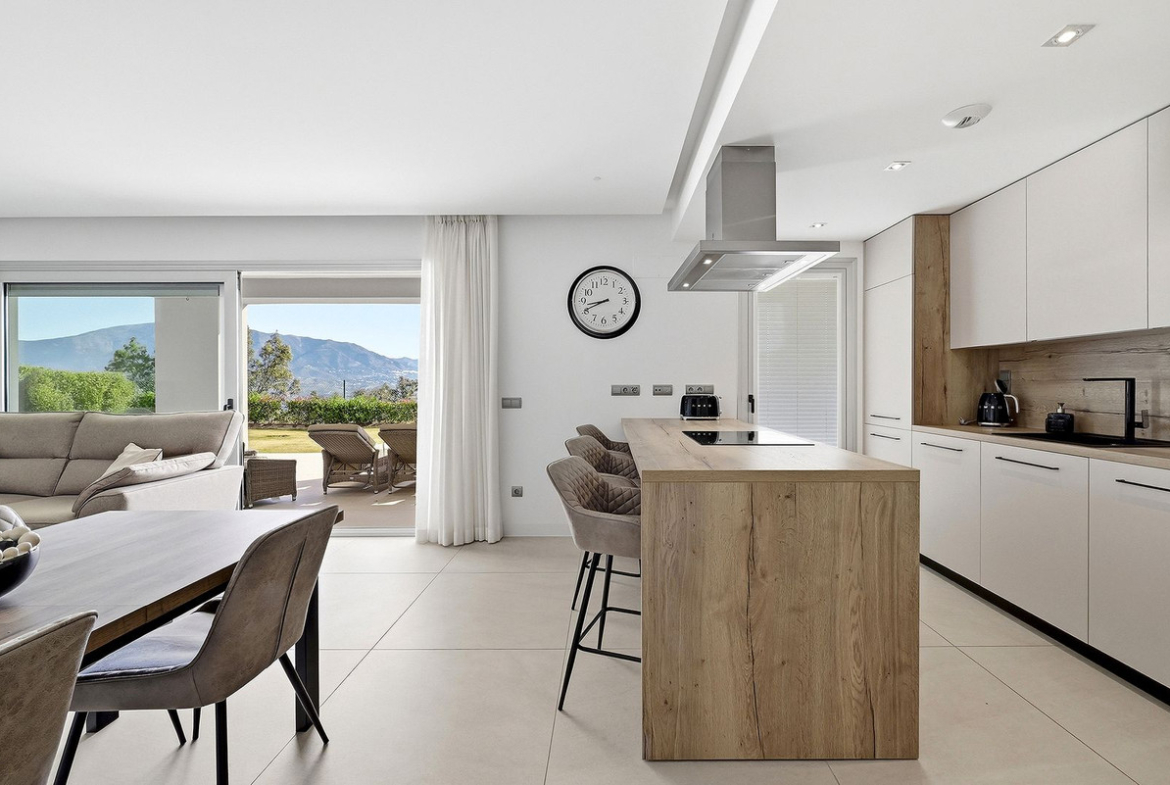 Inside, the open-plan living and dining area is flooded with natural light through floor to ceiling windows, seamlessly connecting to a sleek, fully fitted modern kitchen with a separate laundry room. The layout flows effortlessly onto the terrace, embracing a true indoor-outdoor lifestyle.