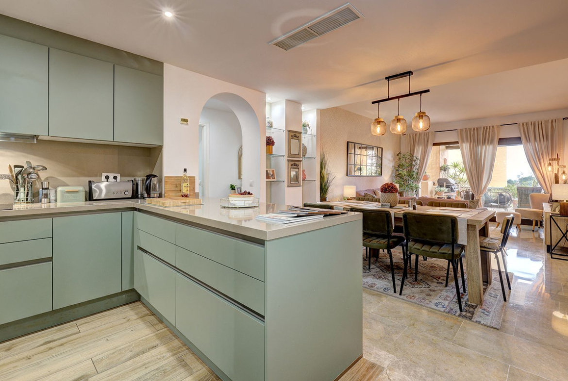 Inside, the home impresses instantly. The newly renovated, made-to-measure designer kitchen is a real showstopper—crafted with quality, style, and functionality for those who love to cook, host, and enjoy everyday living at its best. The open-plan living and dining area flows beautifully onto a covered terrace with captivating mountain, golf, and pool views, making indoor-outdoor living effortless.