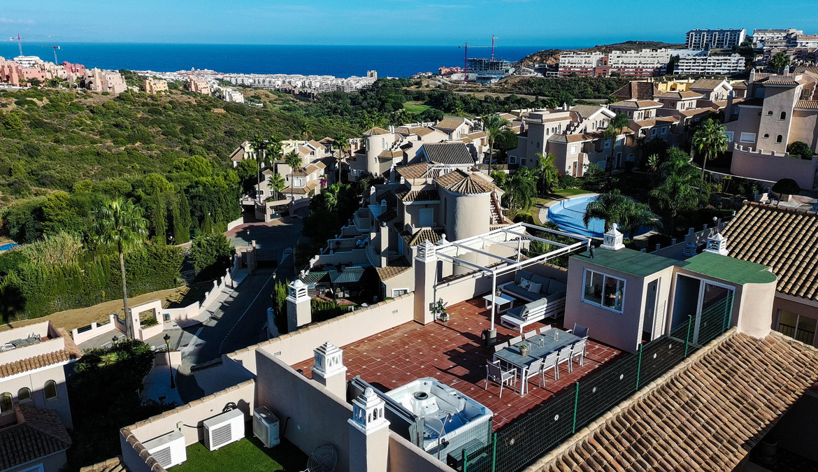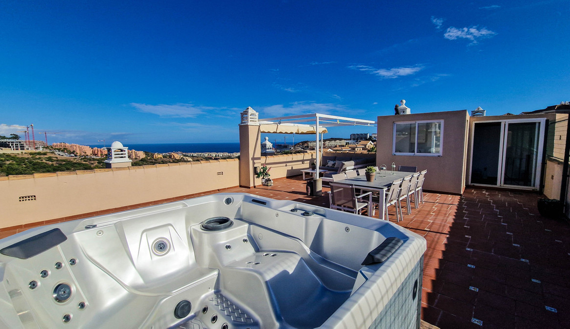 The open-plan living area flows effortlessly onto a private terrace, where panoramic views stretch across the landscape and beyond. An impressive solarium provides additional outdoor space — ideal for entertaining or unwinding — complete with an outdoor kitchen and jacuzzi for enjoying the warm Spanish evenings in total privacy. in addition you get to enjoy communal swimmingpools in plural and lush, wellkept gardens, throughout the urbanisation.