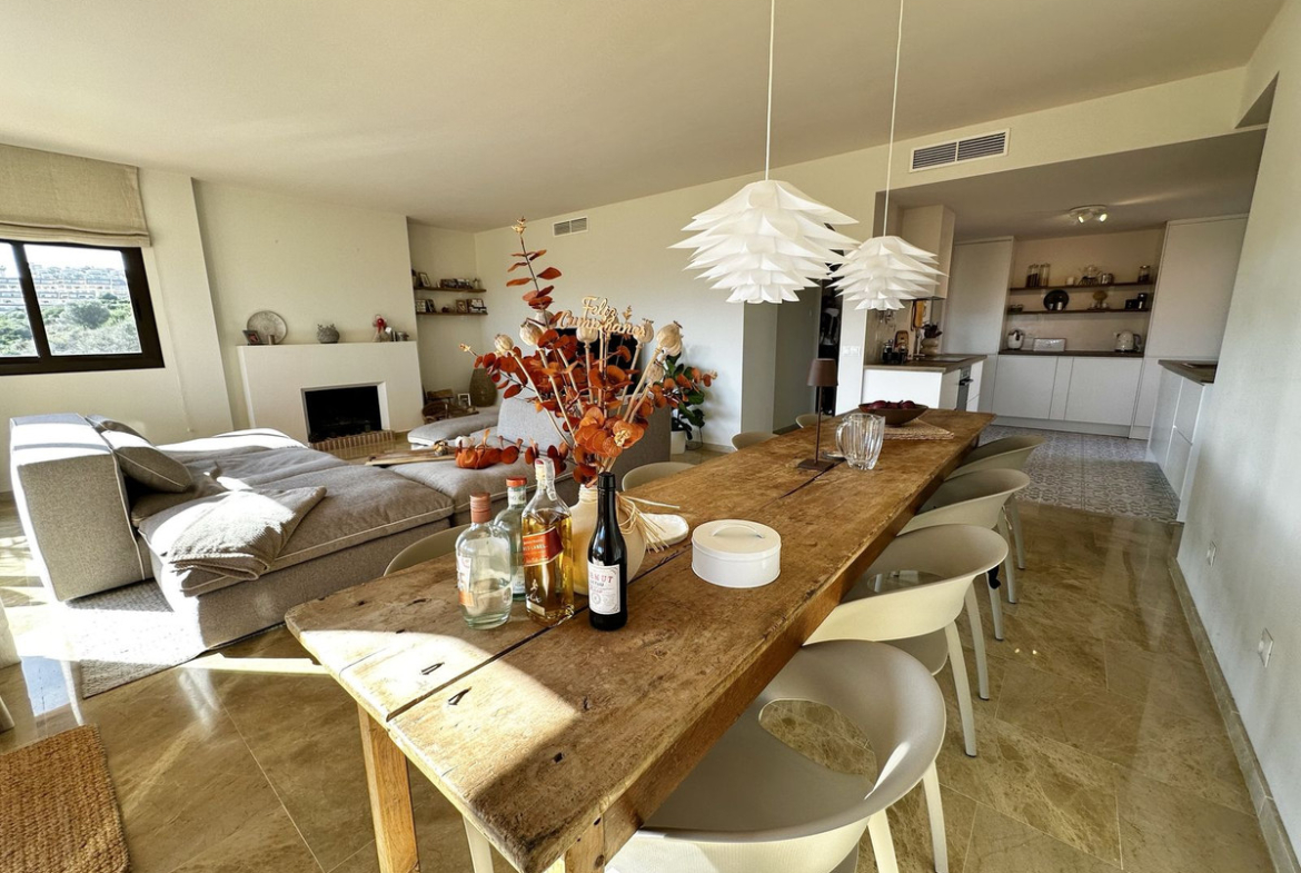 The penthouse has been fully refurbished to a high modern standard and includes a brand new open plan kitchen seamlessly connected to a spacious living and dining area. The living room benefits from breathtaking sea and golf views and features an open fireplace, adding warmth and character. The master bedroom is completely separated from the other bedrooms, ensuring privacy, and includes an ensuite bathroom with a walk-in shower. The second wing of the apartment offers two additional bedrooms with their own hallway and a fully renovated bathroom, making this layout ideal for families or guests.