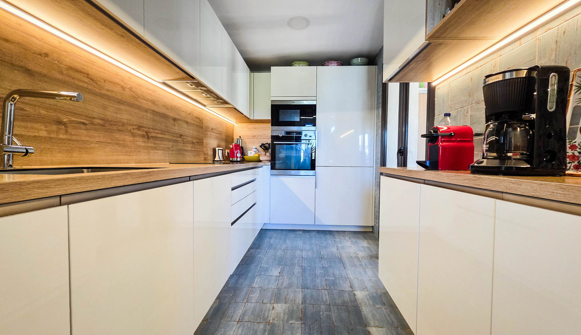 The apartment features three bedrooms and two bathrooms, including a refurbished kitchen and updated bathroom finishes that add a modern touch to the interior. The living and dining area opens directly onto a large private terrace, where sea views form a natural backdrop to daily life. A central section of the terrace has been enclosed with glass curtains, creating a bright extension of the living room that can be enjoyed in all seasons while still allowing flexibility to open the space fully.