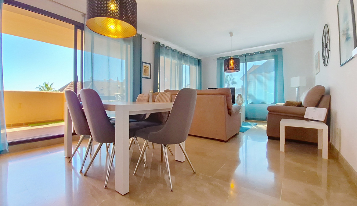 It consists of three bedrooms, the master one being en-suite. The other two share the same bathroom and enjoy views of the green areas of the development. It also features a large fully-equipped kitchen, a laundry room and a spacious living room with sea views.