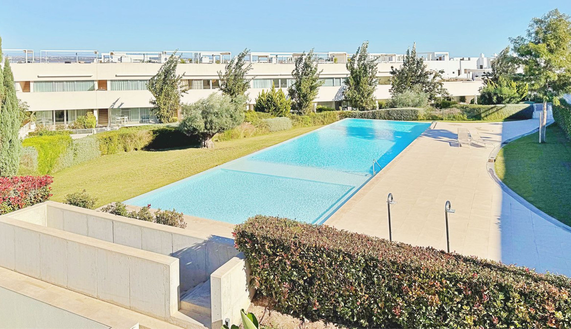 Inside, the penthouse offers a spacious and elegant atmosphere, with a modern open-plan kitchen and a bright living area connected to a generous terrace overlooking the infinity-style swimming pool and landscaped gardens. Large floor-to-ceiling windows create a seamless transition between indoor and outdoor spaces, enhancing the sense of openness and wellbeing.