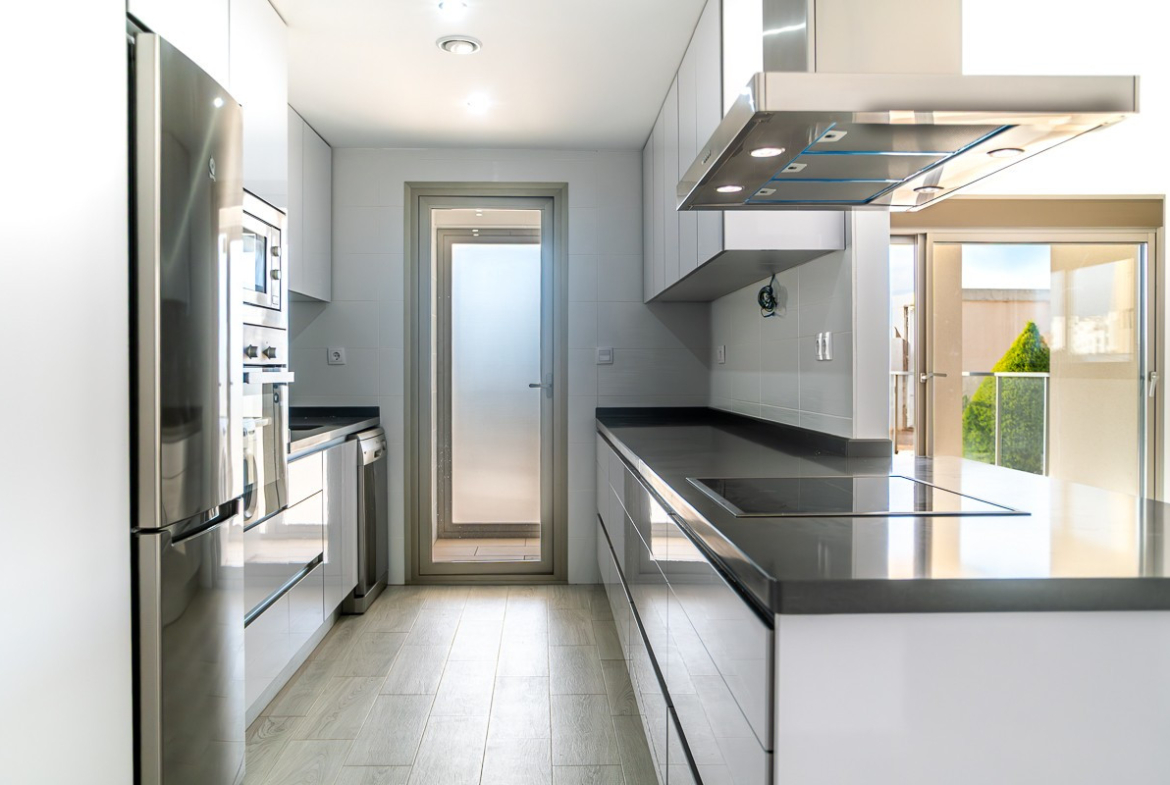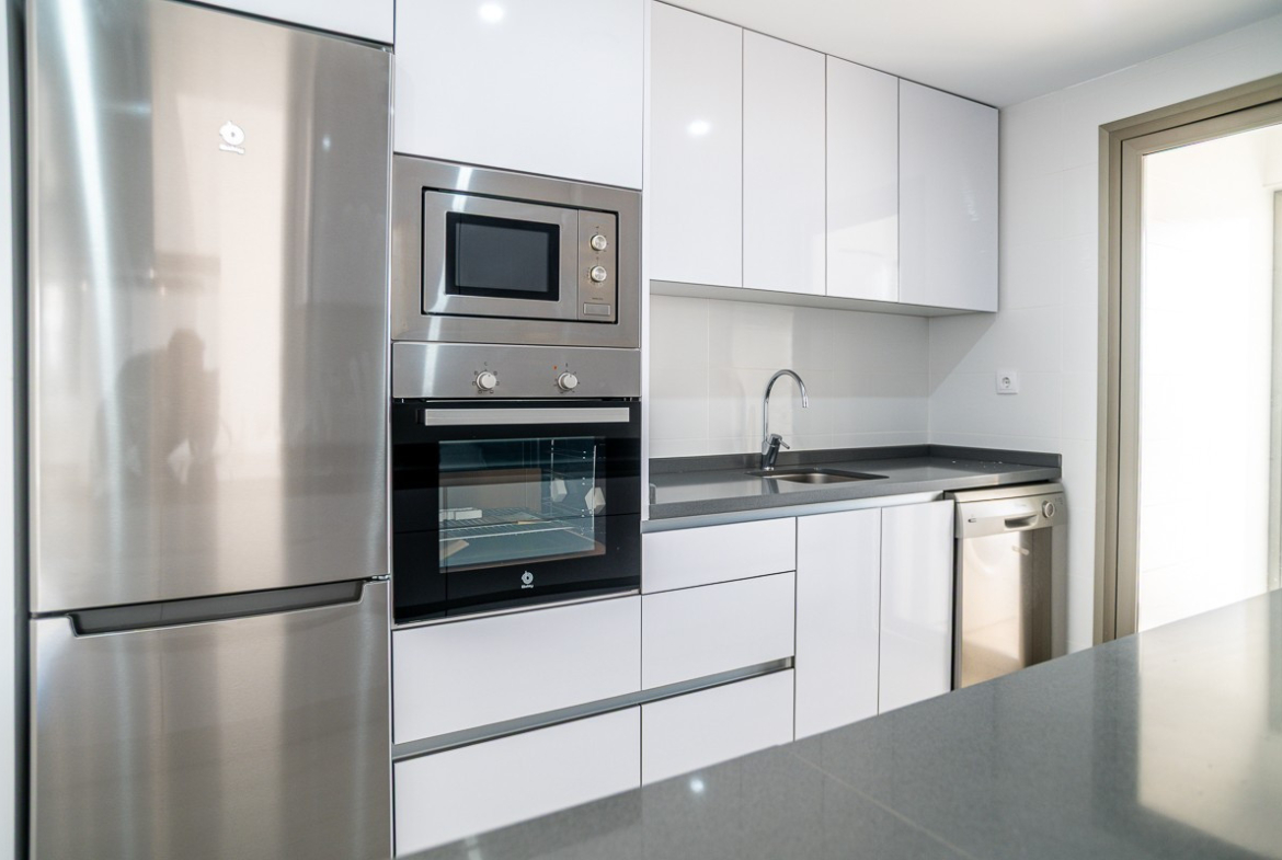 The apartment in Villa Martin has 3 bedrooms. 1 master bedroom with en-suite bathroom including underfloor heating and 2 very spacious guest rooms. The large and spacious living room gives a pleasant feeling and is visible from the half-open American kitchen. Whether you like to cook or not… A large kitchen with many cupboards and equipped with all appliances is always an added value. If you walk through the kitchen you have a separate laundry room.