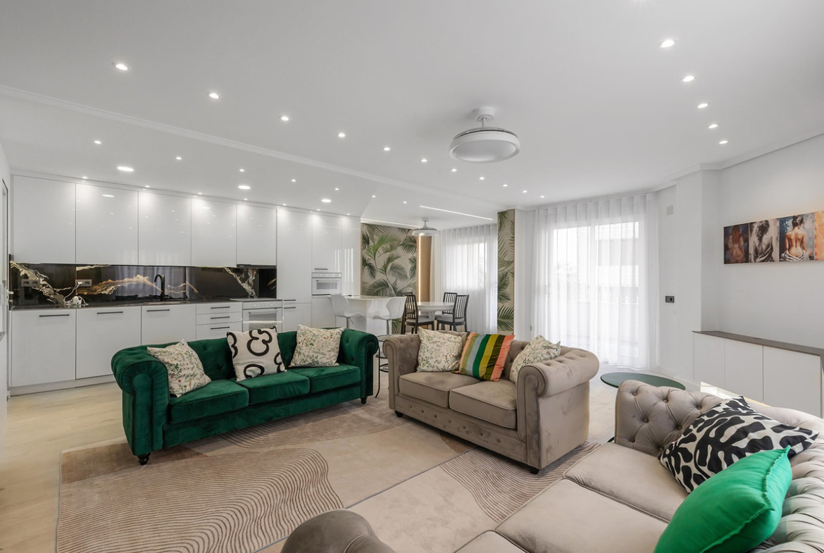 The property features three generously sized bedrooms and two elegant bathrooms, all finished to an impeccable standard. Designed with both style and functionality in mind, the apartment boasts a bright and spacious open-plan living area that seamlessly connects the lounge, dining area, and a modern designer kitchen. High-quality materials, sleek cabinetry, integrated appliances, and refined finishes create a sophisticated yet welcoming atmosphere throughout.