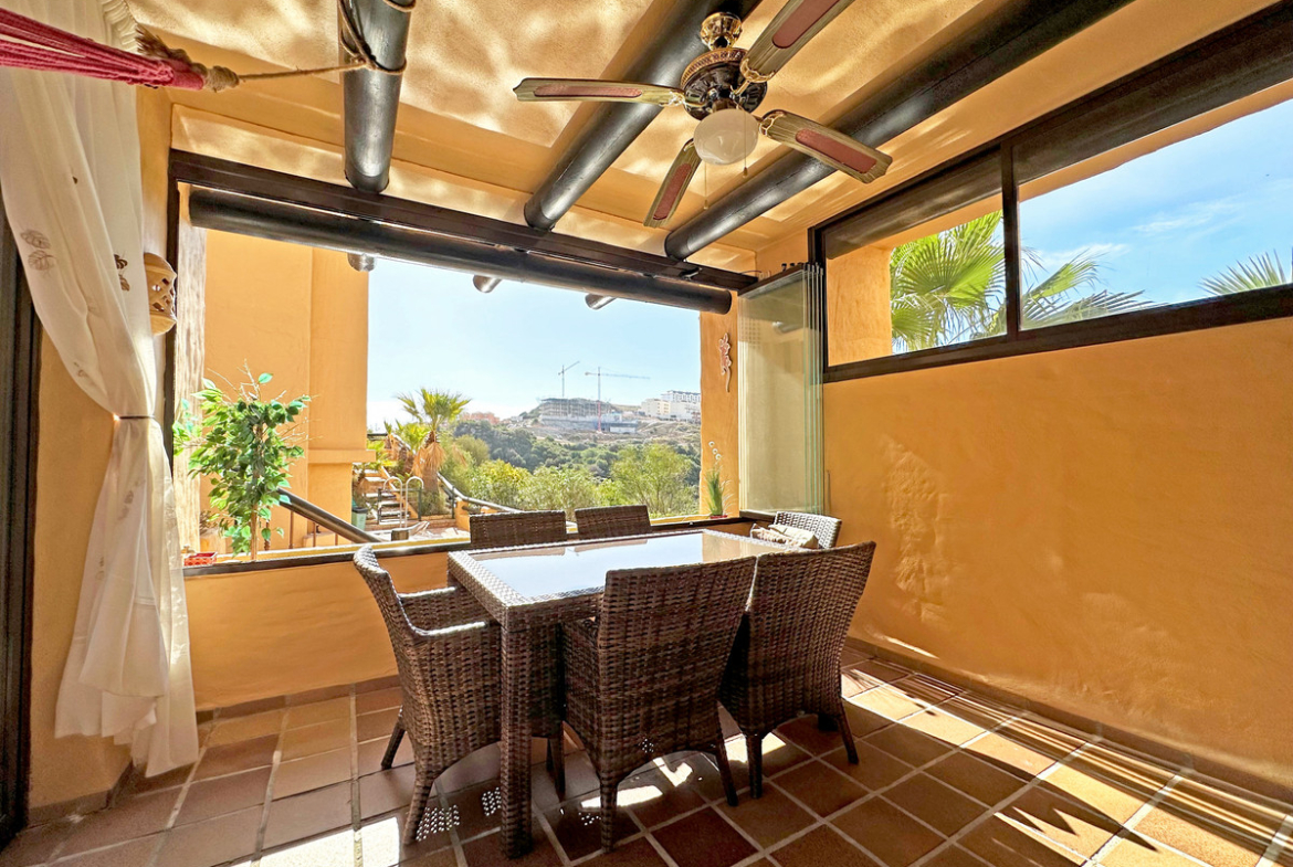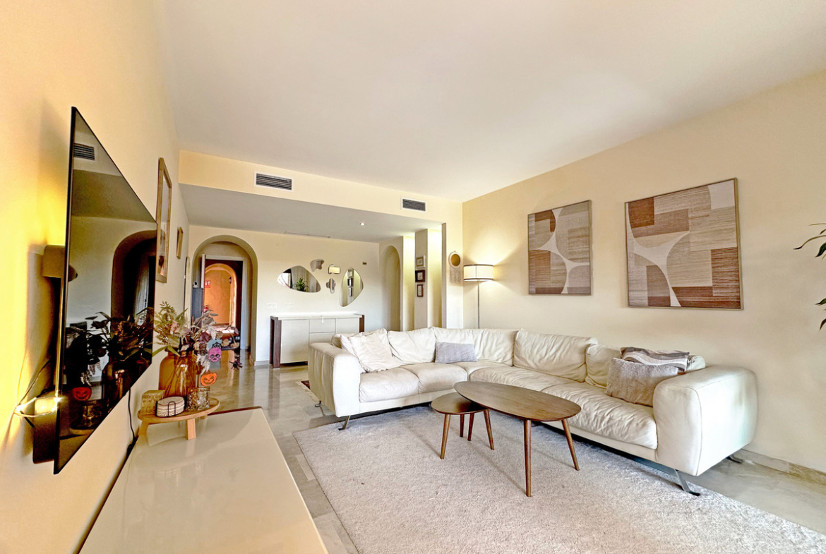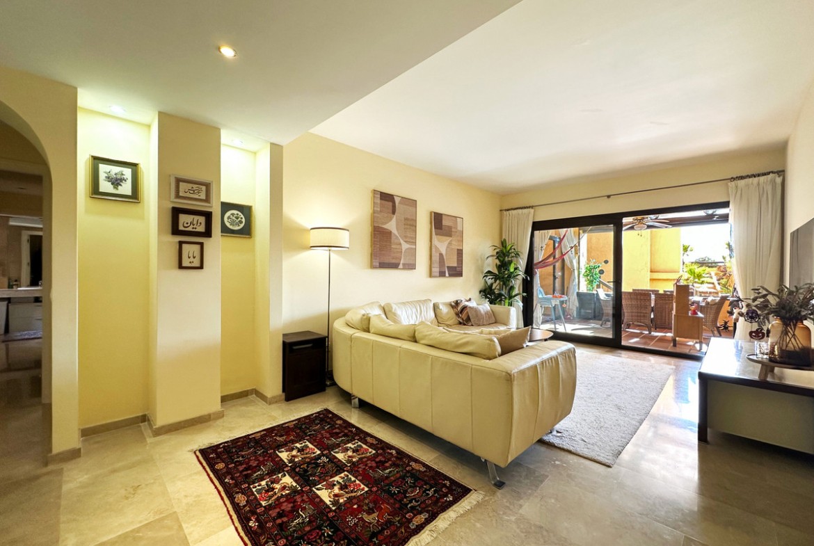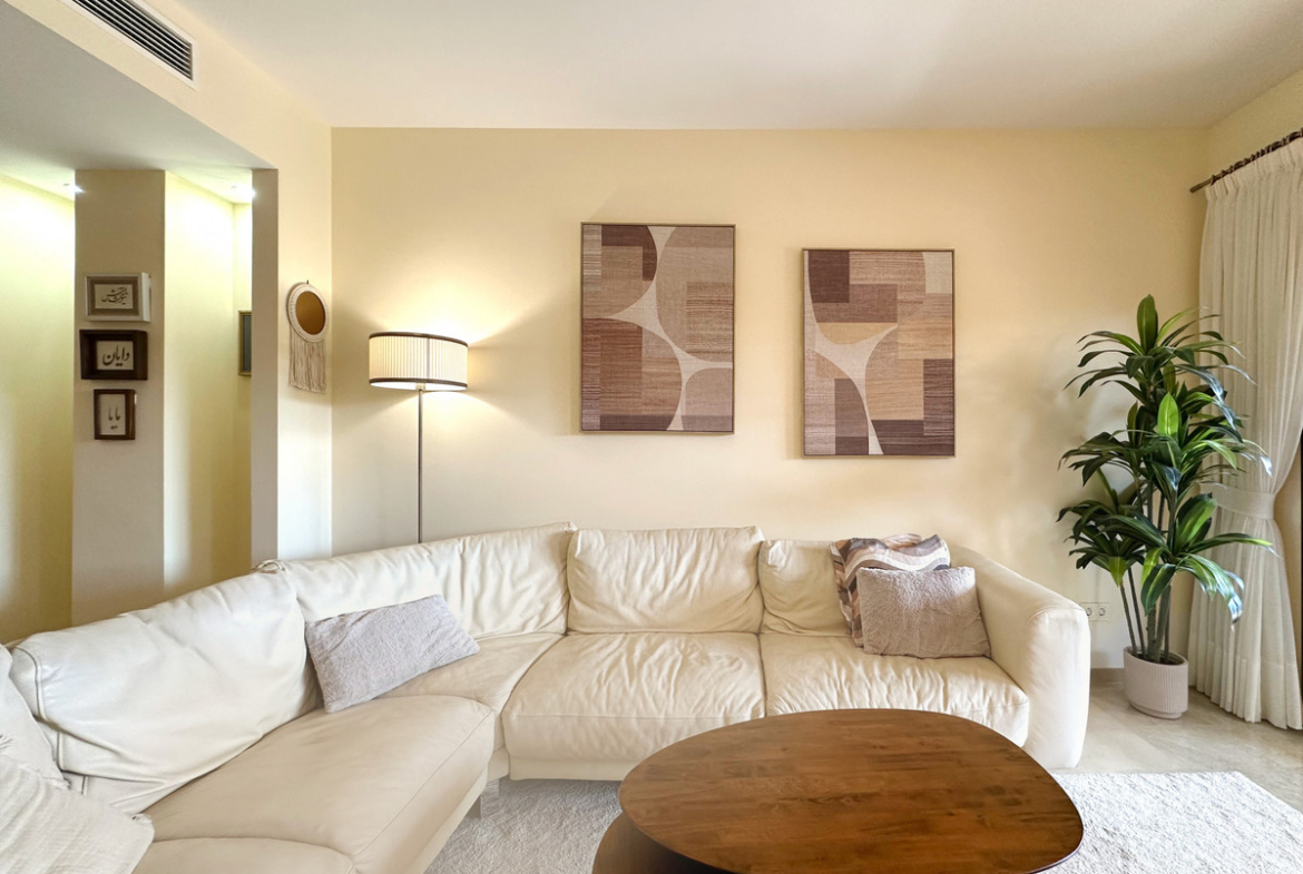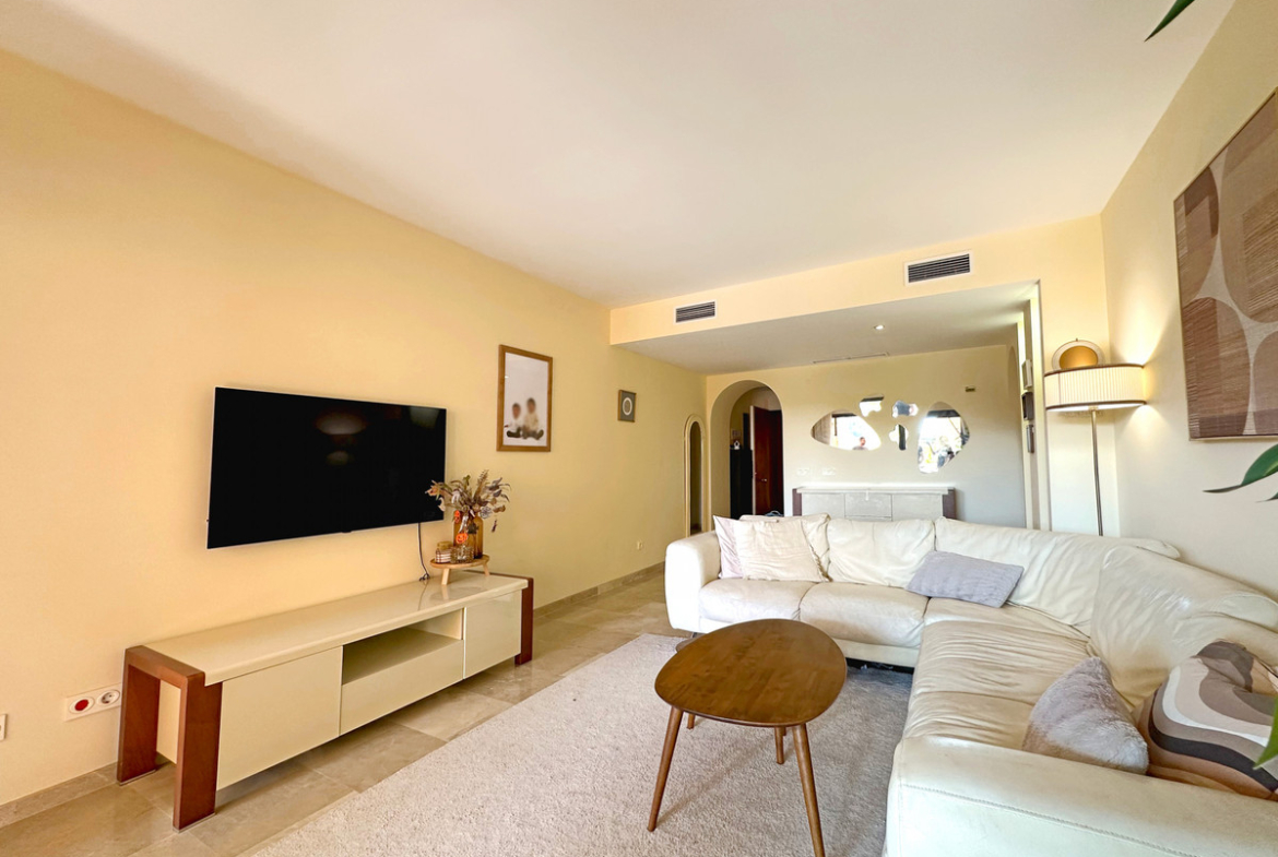 The spacious living room opens onto a Lumon glazed terrace, where you can relax and enjoy pleasant views of the pool and golf course throughout all seasons.