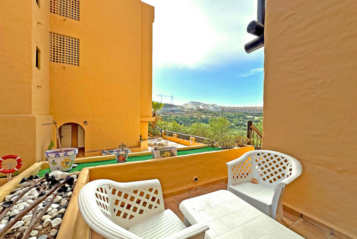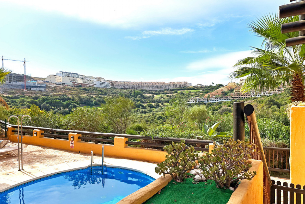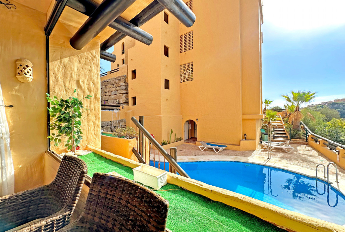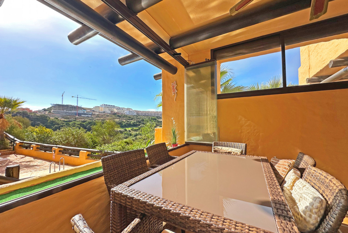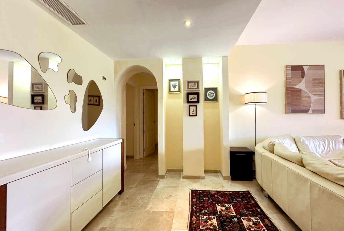 The spacious living room opens onto a Lumon glazed terrace, where you can relax and enjoy pleasant views of the pool and golf course throughout all seasons.