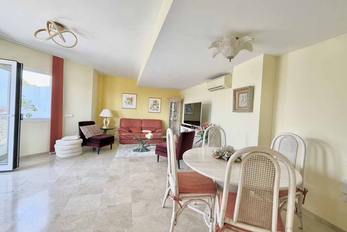 Upon entering, you are welcomed by a **spacious living and dining area**, ideal for relaxation or entertaining. To the left, a **separate kitchen** with large windows offers a picture-perfect view of the sea. From the **main terrace**, you can enjoy an **unobstructed view of Gibraltar and the Mediterranean**.