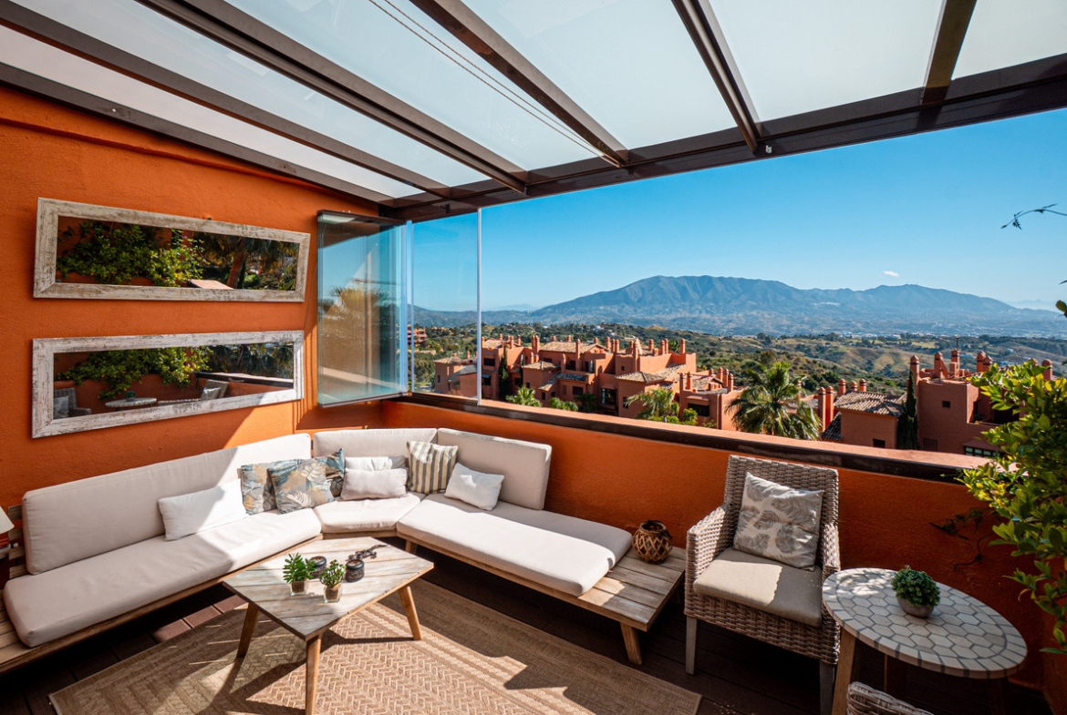 Penthouse Greenvalley is a luxury duplex in Marbella with breathtaking panoramic views. The home features three terraces, three bedrooms, and elegant modern finishes. The spaces are bright and open, designed for comfort and natural light throughout the day. Located in an exclusive golf community, this home combines privacy, style, and access to world-class amenities.