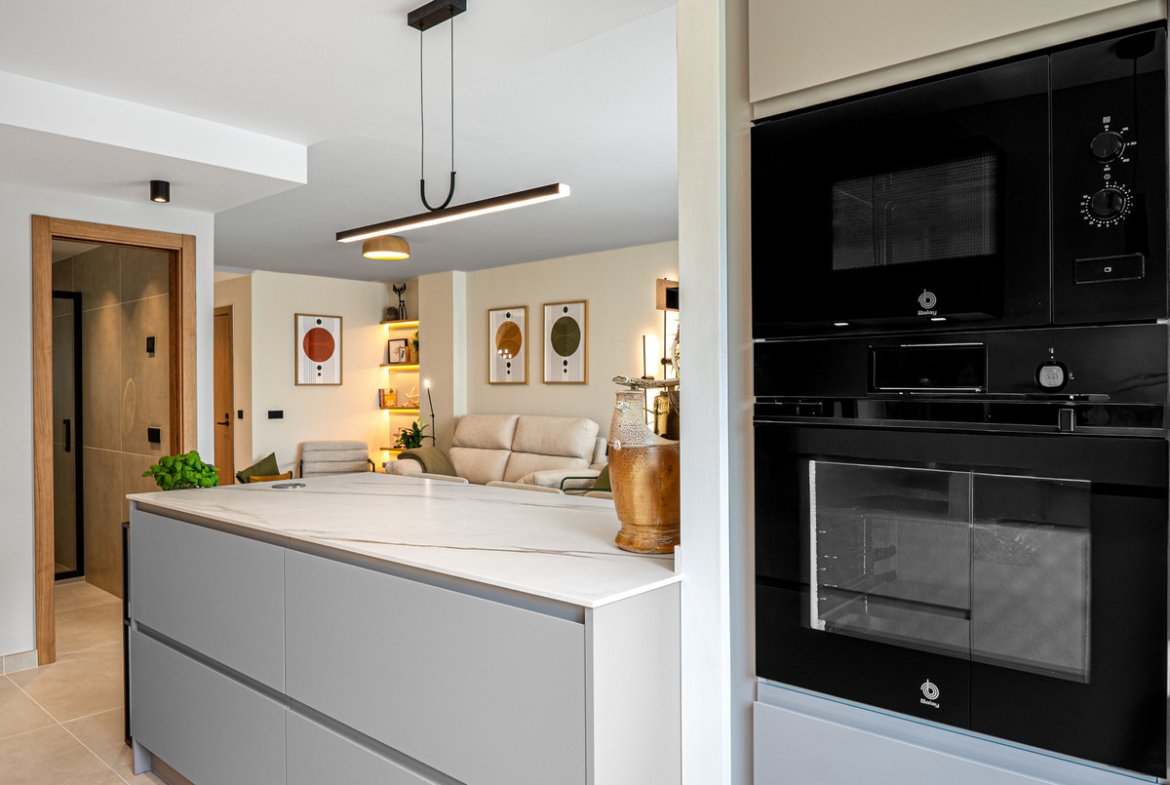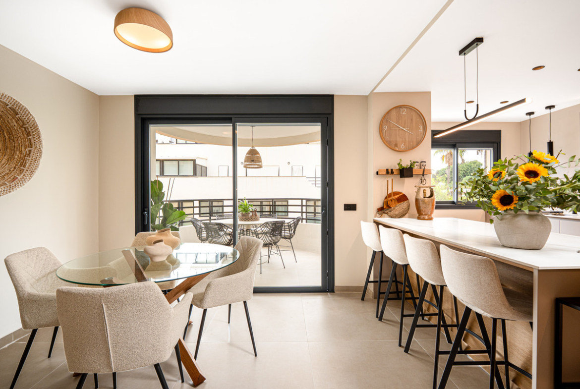 The open-plan layout allows the kitchen to flow seamlessly into the living and dining areas, creating a spacious and inviting environment. The interior design combines neutral-toned floor tiles with clever touches of wood and soft furnishings, producing an atmosphere of tranquility and sophistication. The kitchen is a highlight, equipped with first-class appliances, deep cupboards, and generous worktop space. A stylish breakfast bar offers an alternative to the dining table, providing a more informal yet elegant dining option. From all main living spaces, sliding doors open onto the terrace, where a dining table sets the scene for alfresco meals or evening drinks in the Marbella sunshine.