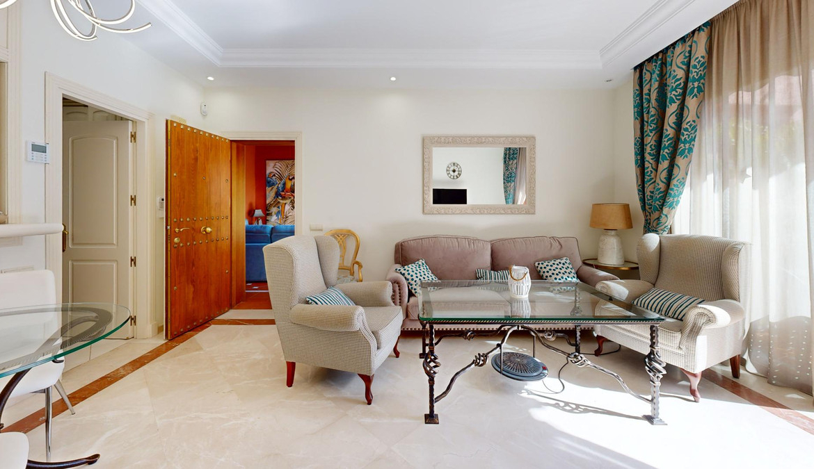 Upon entering, we are greeted by a large glazed terrace with orientation East, from which we can appreciate the views to the gardens and to one of the communal swimming pools, an ideal space to enjoy all year round. This terrace connects with a bright living room that leads to a second terrace, where the sun shines all morning.