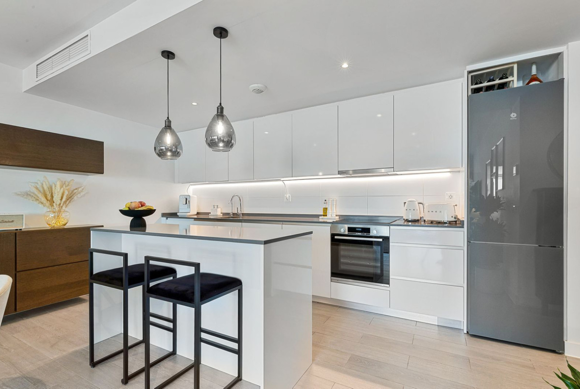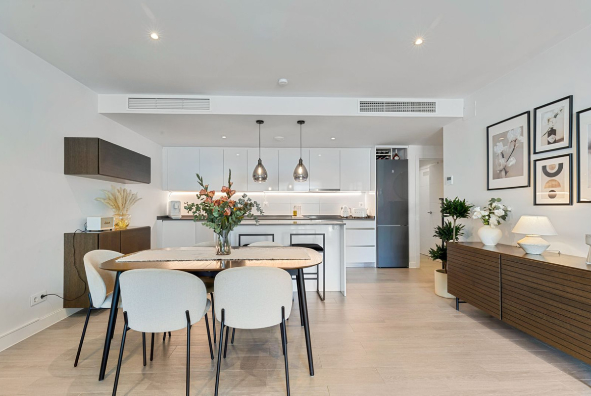 As a ground floor apartment, the home truly shines through its open connection between the kitchen, living room, and main terrace. This terrace extends naturally from the living area, offering space for a barbecue and relaxed outdoor dining – perfect for long evenings and shared meals. A second terrace is connected to the master bedroom, enjoying the morning sun and providing a quiet retreat to start the day.