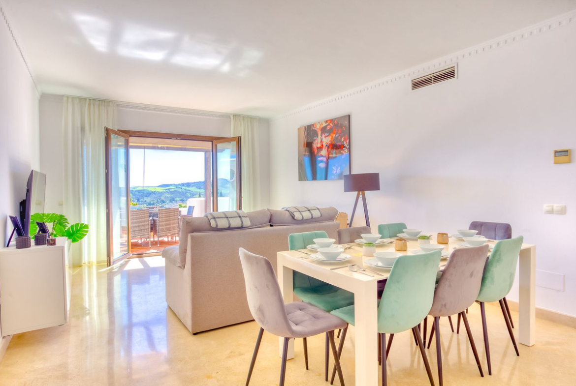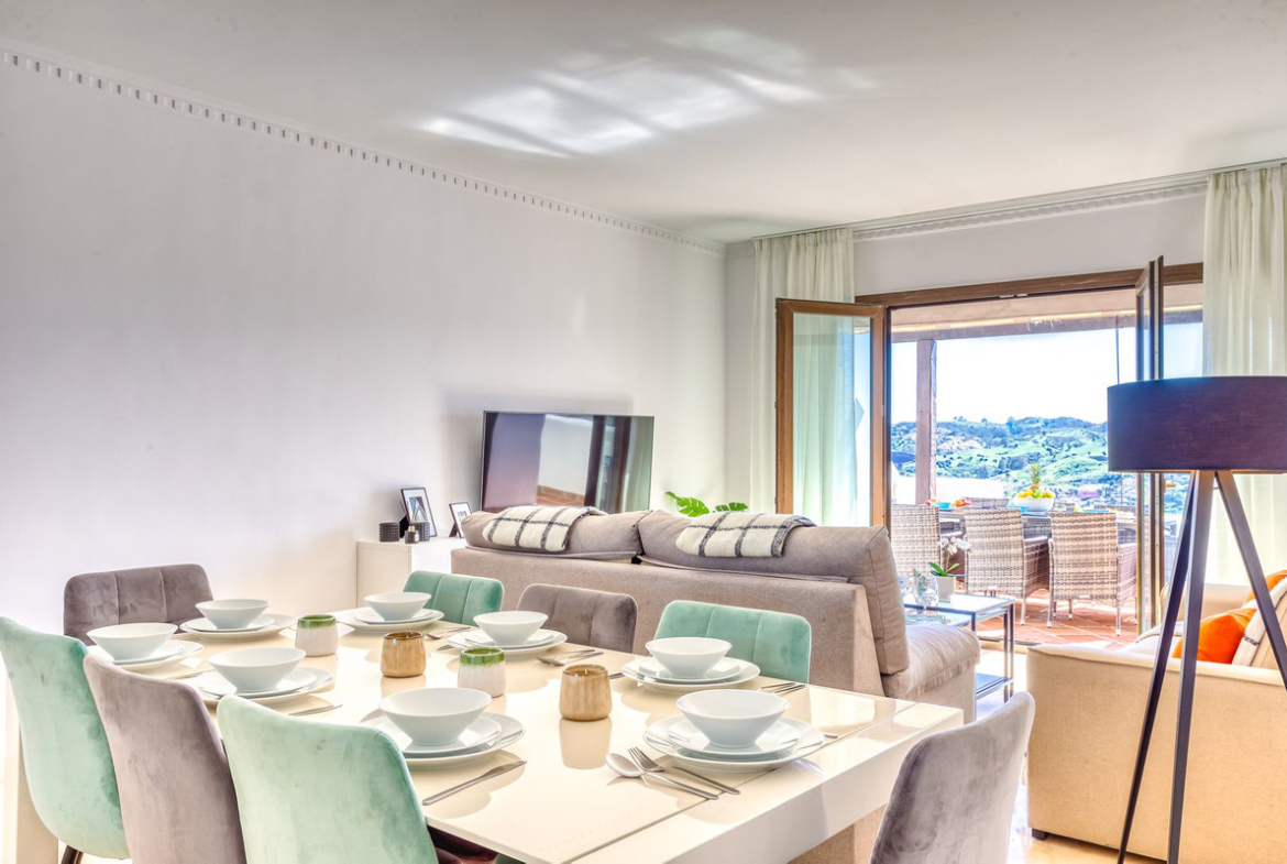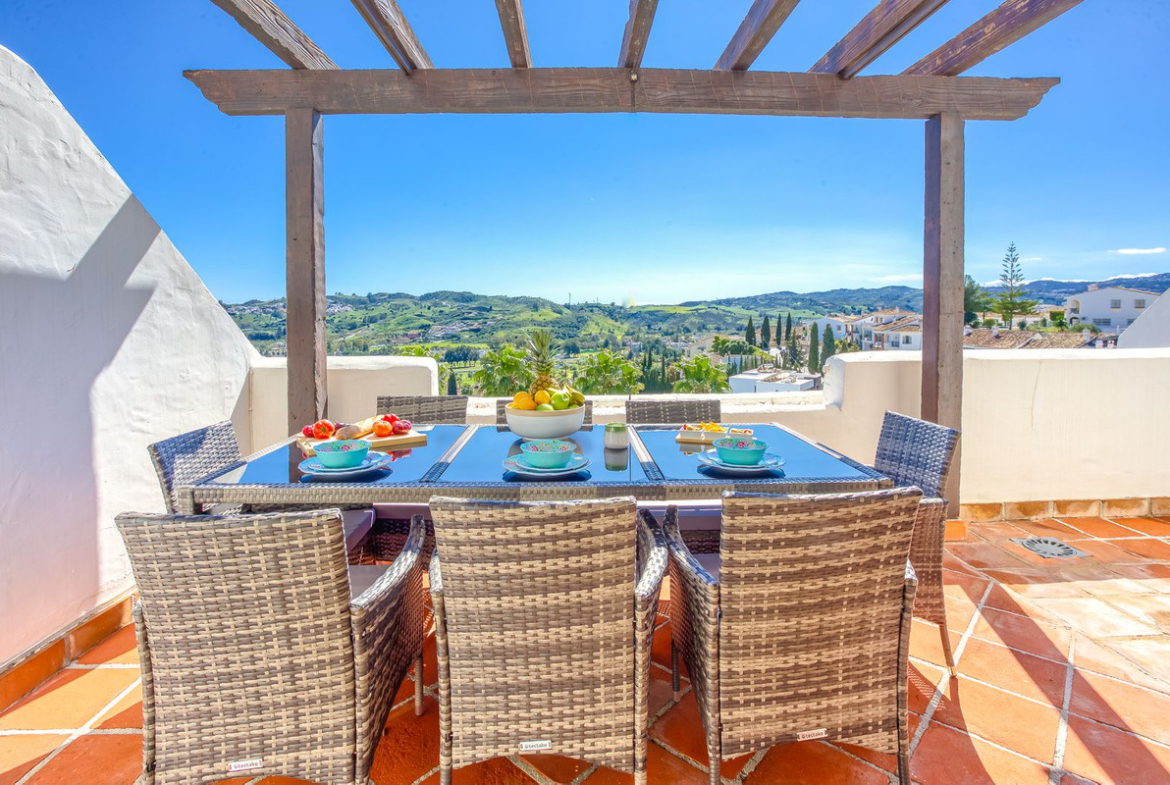 This south-facing penthouse boasts panoramic views over the lush fairways of Mijas Golf and the surrounding mountain range. Enjoy sun-drenched terraces and a peaceful setting, all within easy reach of local amenities.