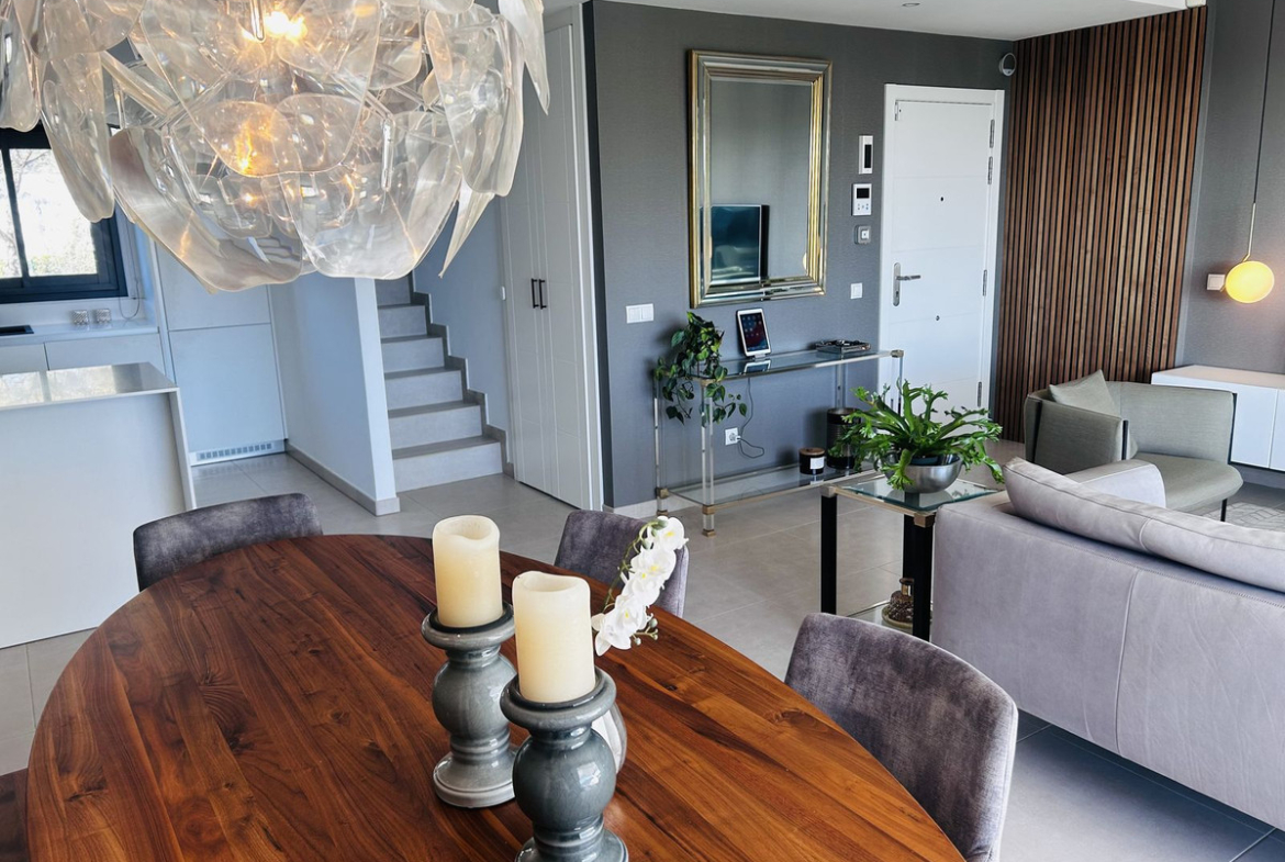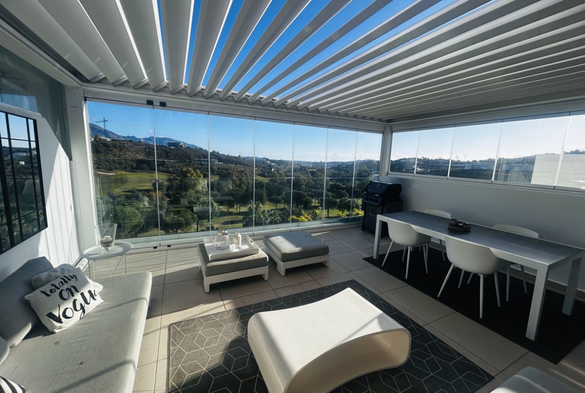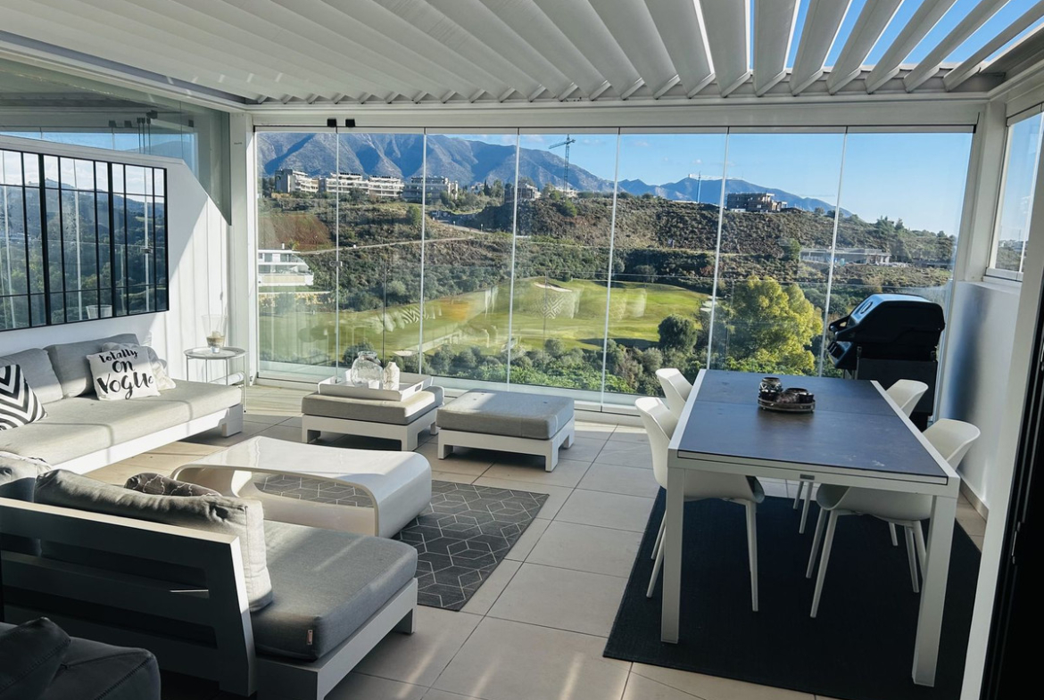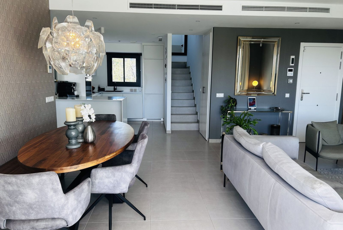 The penthouse is situated directly on the front line of the famous “Campo America” golf course and offers breathtaking panoramic views of the mountains, golf courses and the Mediterranean Sea. It is distributed over 2 floors. On the main floor, the elegant living-dining area opens into a spacious terrace where sunrise become a masterpiece. The open-plan, fully equipped kitchen with Bosch electric appliances is designed for family meals and is complemented by practical utility cabinets. Two additional bedrooms offer comfort and privacy with a stunning view on the golf course and share the guest bathroom.