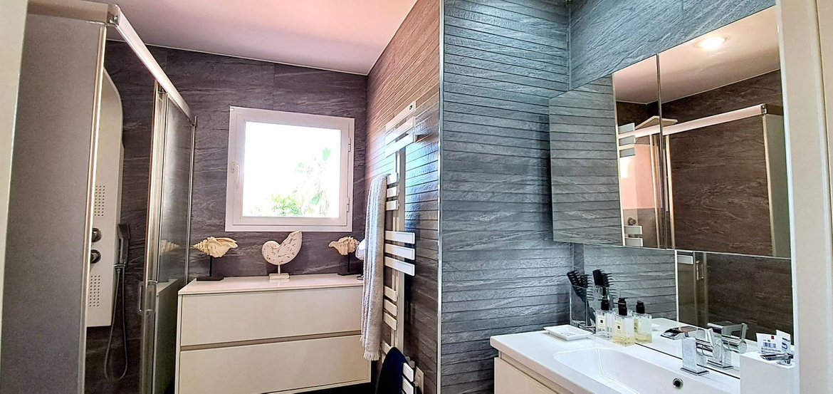 By entering the main level you find the south facing living/ dining area leading out to one of the four terraces, a modern & well equipped brand new kitchen, two bedrooms sharing the renovated modern shower room and as well a guest toilet.
