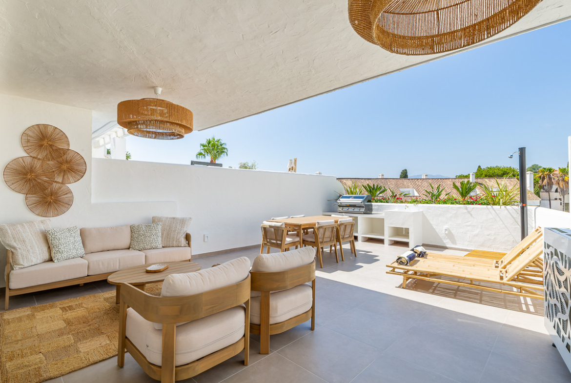 Fantastic apartment completely renovated with luxury qualities and fully furnished that you will fall in love with as soon as you enter it. Located in the heart of Nueva Andalucía, in the gated community El Dorado, which is 10 minutes walk from Centro Plaza Shopping Center and 20 minutes from Puerto Banús.