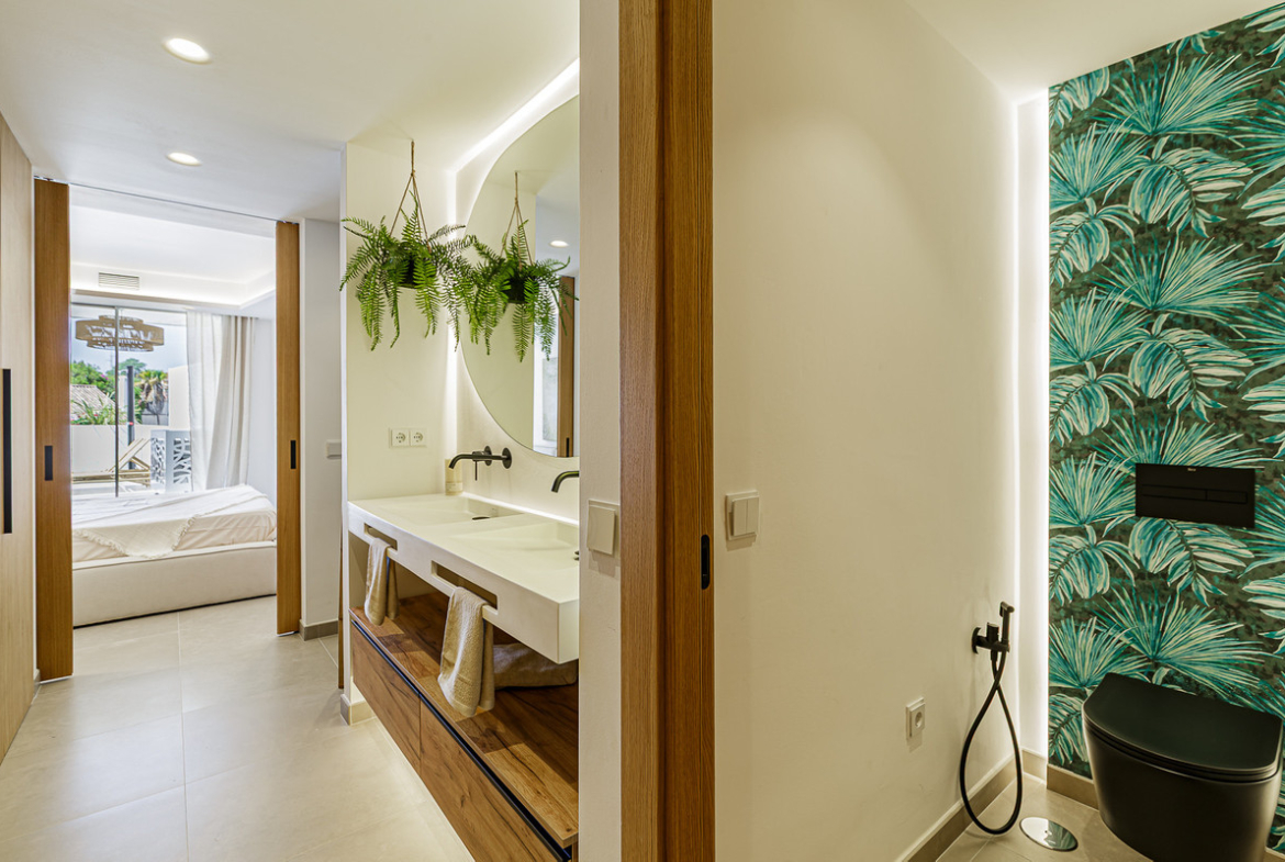 In addition, there are two spacious double bedrooms and a secondary bathroom with stone countertop, built-in taps, LED-lit mirror, and designer shower. Beyond its elegant design, the property stands out for its perfect southwest orientation, making it exceptionally bright and ideal for enjoying its magnificent 50 m² terrace. The terrace is enhanced with decorative wall lighting, tropical landscaping with automatic irrigation, an outdoor kitchen with sink, and a built-in Grandhall barbecue, as well as the comfort of a solar-heated outdoor shower—a unique space created to share unforgettable moments. This is a one-of-a-kind home, exquisitely decorated with the utmost attention to detail.