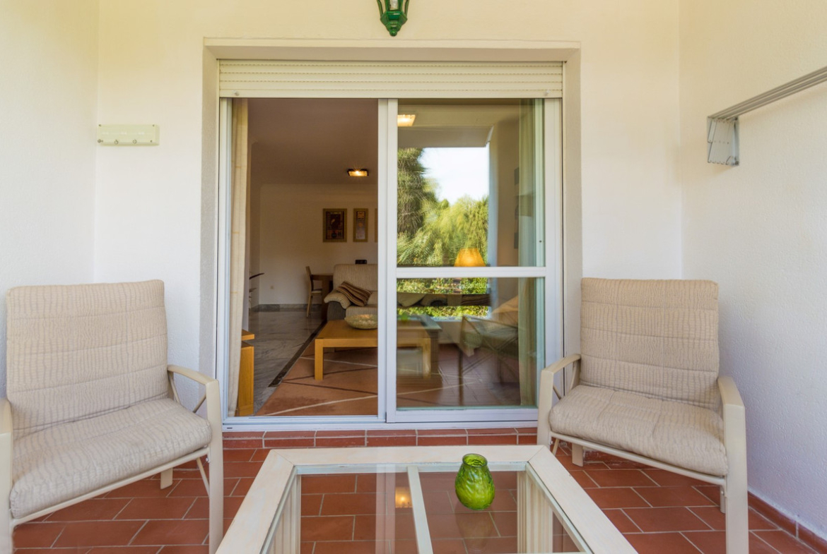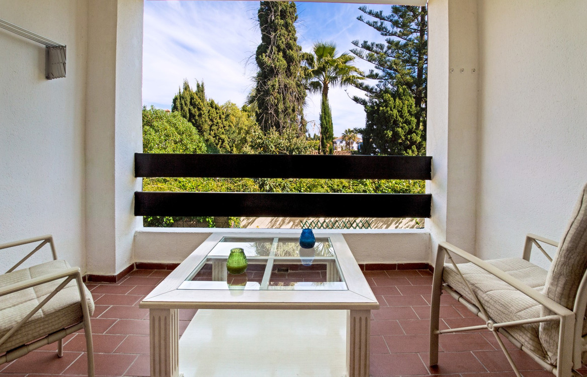 Spectacular apartment with 3 bedrooms, 2 bathrooms and 125m2 of interior, located on the 1st floor, facing east. Furnished and decorated with attention to detail, the property consists of an entrance hall, a spacious living-dining room with access to a fantastic covered terrace of 10m2 with views of the mountains and the gardens of the urbanization. 3 bright bedrooms (one of them ¨en-suite¨), with fitted wardrobes and double glazed windows, second bathroom and a separate and fully equipped kitchen. Marble floors, hot and cold air conditioning, television and internet installation.