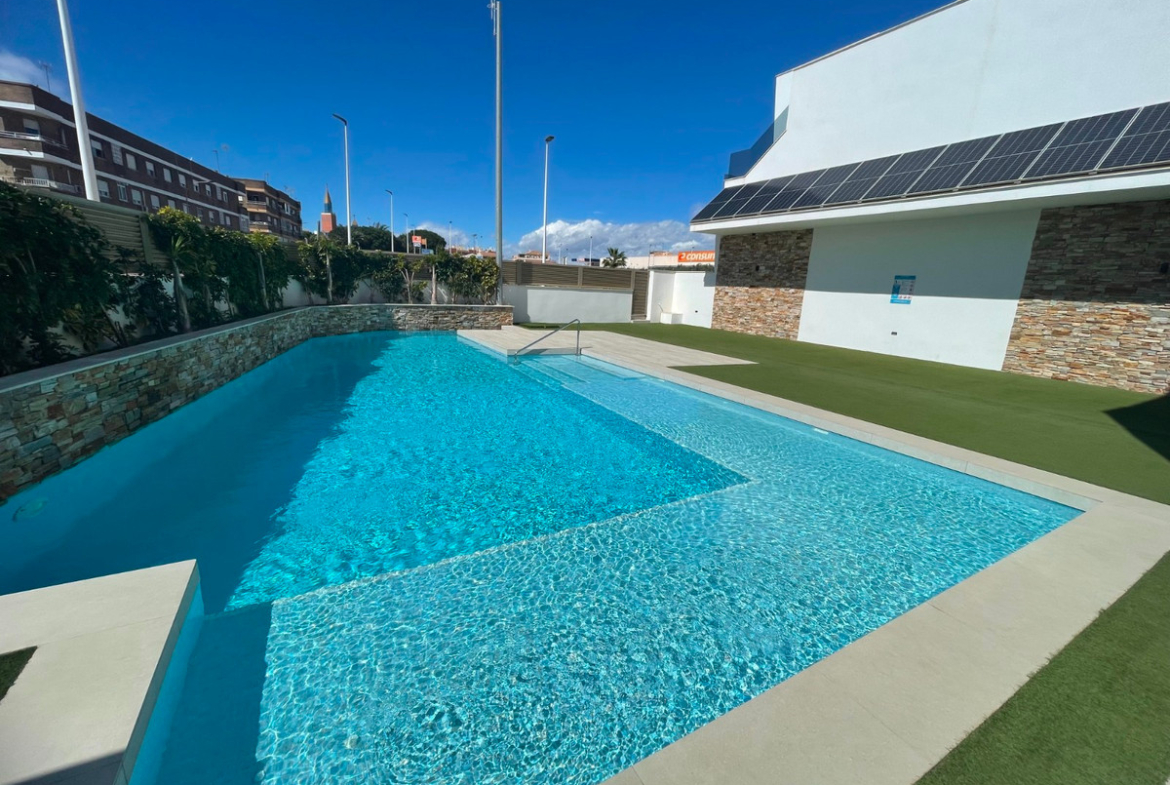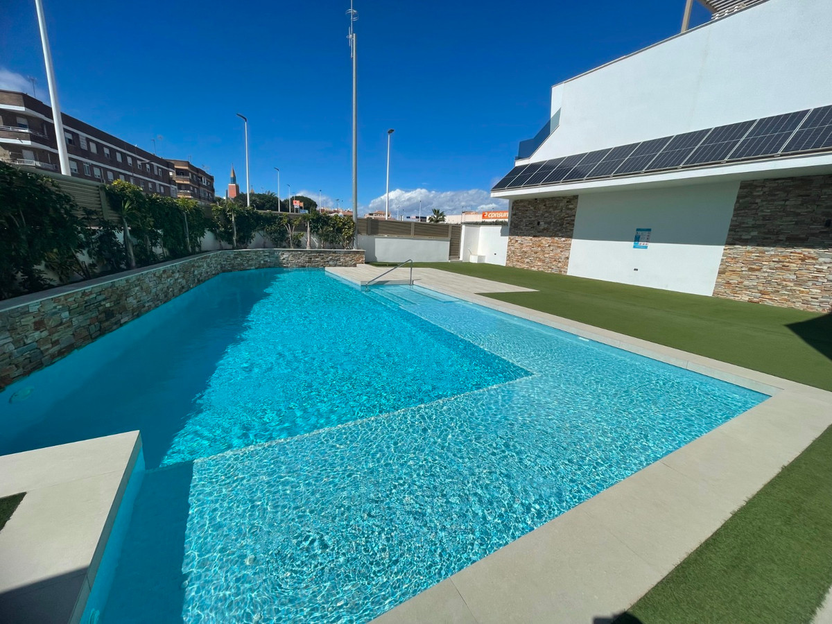 This West Facing, Three Bedroom, Top Floor Apartment in San Pedro del Pinatar is located in the heart of this popular town, within walking distance to a wide range of amenities, including supermarkets, and on the edge of the beautiful natural nature park. Just a 5-minute drive to the stunning beaches and the famous Lo Pagan clay baths, and only 10 minutes to several golf courses, this property offers a prime location on the Costa Blanca South. Modern and stylish, the apartment features an open-plan design with a bright lounge area that opens through sliding glazed doors onto a lovely terrace. The well-fitted modern kitchen adds to the contemporary feel of the home. There are three double bedrooms, two of which have built-in wardrobes, and two modern shower rooms, one of which is en suite. External stairs provide access to a private 62m2 solarium, complete with a fantastic kitchen work area, ideal for outdoor entertaining. The property is part of a community with a beautiful communal pool area and also benefits from off-road parking, a private store room, and air conditioning for comfort. This is a fantastic opportunity to own a modern home in a desirable coastal location.